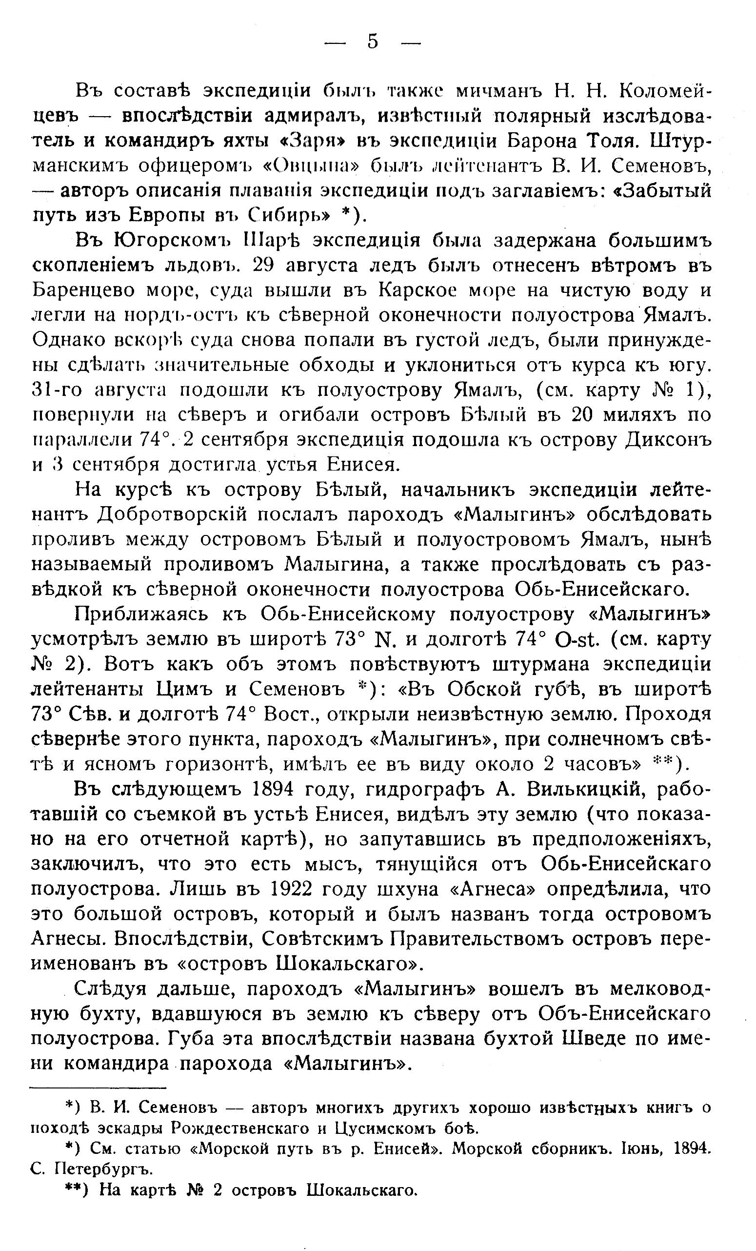 Приближаясь къ Обь-Енисейскому полуострову «Малыгинъ» усмотрѣлъ землю въ широтѣ 73° N. и долготѣ 74° О-st. (см. карту № 2). Вотъ какъ объ этомъ повѣствуютъ штурмана экспедиціи лейтенанты Цимъ и Семеновъ *): «Въ Обской губѣ, въ широтѣ 73° Сѣв. и долготѣ 74° Вост., открыли неизвѣстную землю. Проходя сѣвернѣе этого пункта, пароходъ «Малыгинъ», при солнечномъ свѣтѣ и ясномъ горизонтѣ, имѣлъ ее въ виду около 2 часовъ» **).
