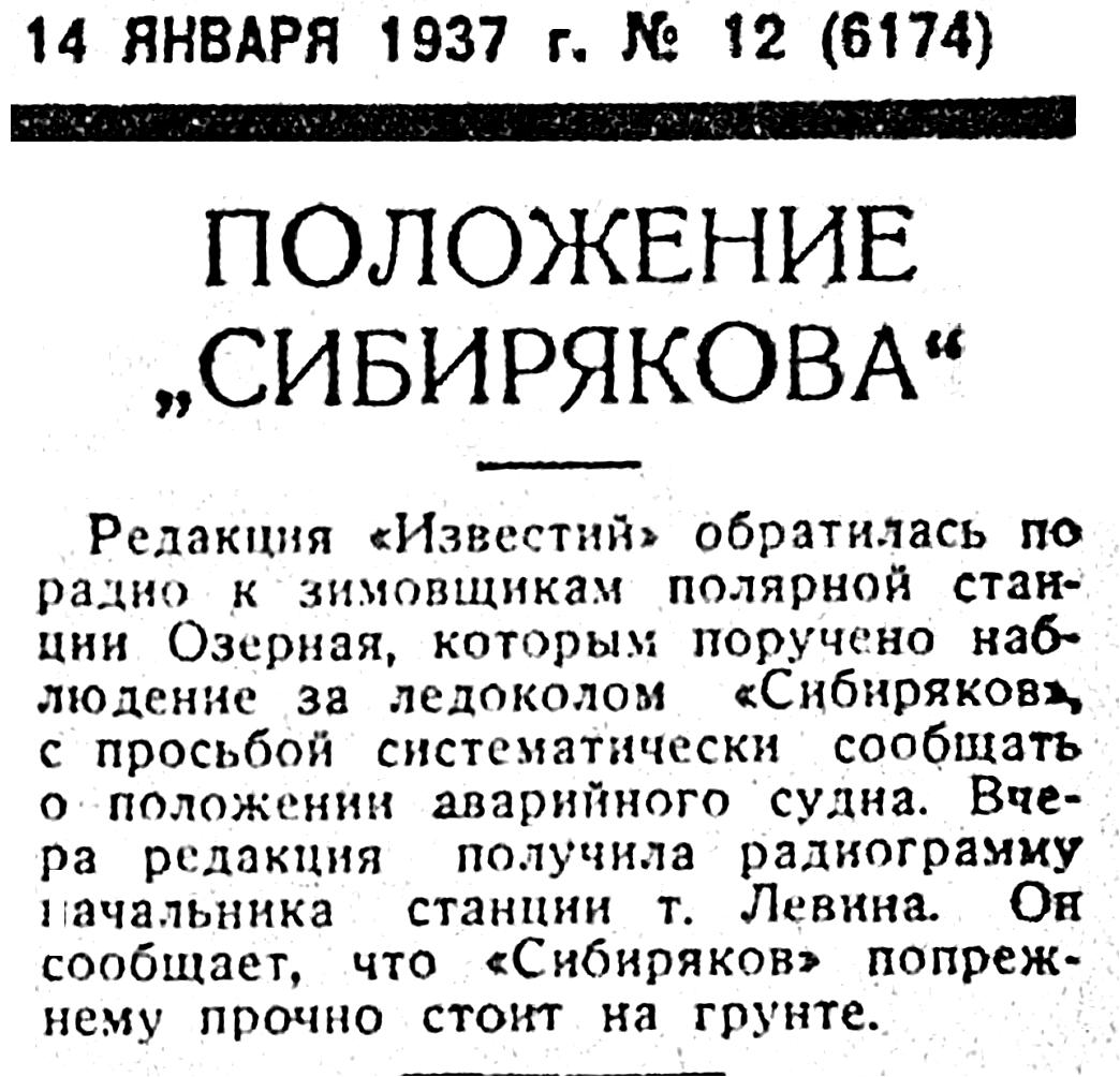 Редакция «Известий» обратилась по радио к зимовщикам полярной станции Озерная, которым поручено наблюдение за ледоколом «Сибиряков», с просьбой систематически сообщать о положении аварийного судна. Вчера редакция получила радиограмму начальника станции т. Левина. Он сообщает, что «Сибиряков» попрежнему прочно стоит на грунте.