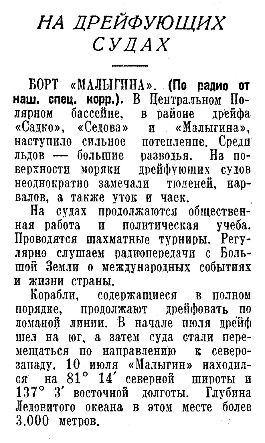 БОРТ «МАЛЫГИНА». (По радио от наш. спец. корр.). В Центральном Полярном бассейне, в районе дрейфа «Садко», «Седова» и «Малыгина», наступило сильное потепление. Среди льдов — большие разводья. На поверхности моряки дрейфующих судов неоднократно замечали тюленей, нарвалов, а также уток и чаек.