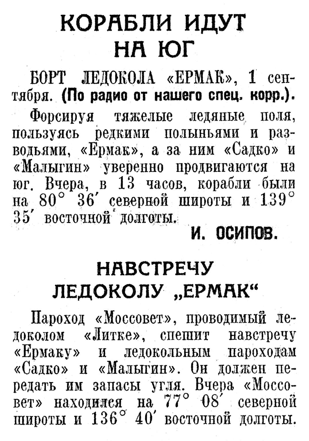 БОРТ ЛЕДОКОЛА «ЕРМАК», 1 сентября. (По радио от нашего спец. корр.).