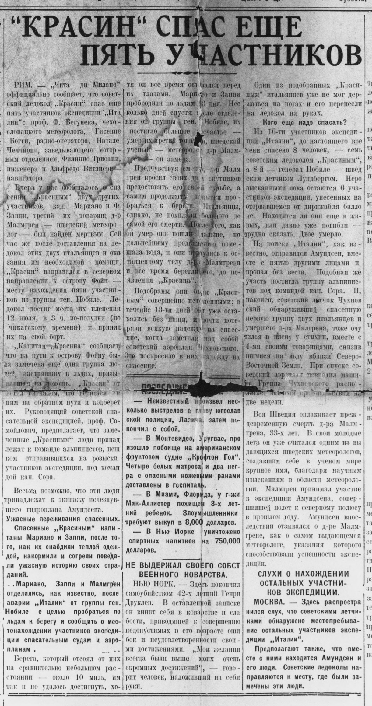 Ледовый поход 1928 г. сделал ледокол «Красин» всемирно известным. За плава-нием судна следили корреспонденты и фотожурналисты, газеты ежедневно пу-бликовали статьи и заметки о ходе спасательной операции. В статье рассказы-вается о ходе пропагандистской кампании по освещению красинского похода.