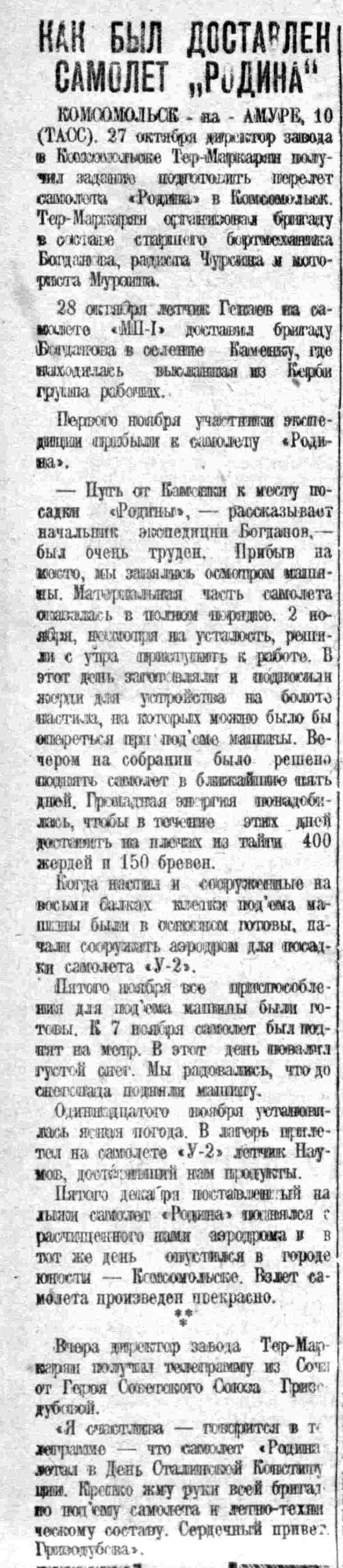 КОМСОМОЛЬСК - на - АМУРЕ, 7 (ТАСС). Самолет «Родина», поднявшийся 5 декабря с места посадки, в тот же день прилетел в Комсомольск. Взлет и посадка произведены хорошо. Материальная часть работала безукоризненно.