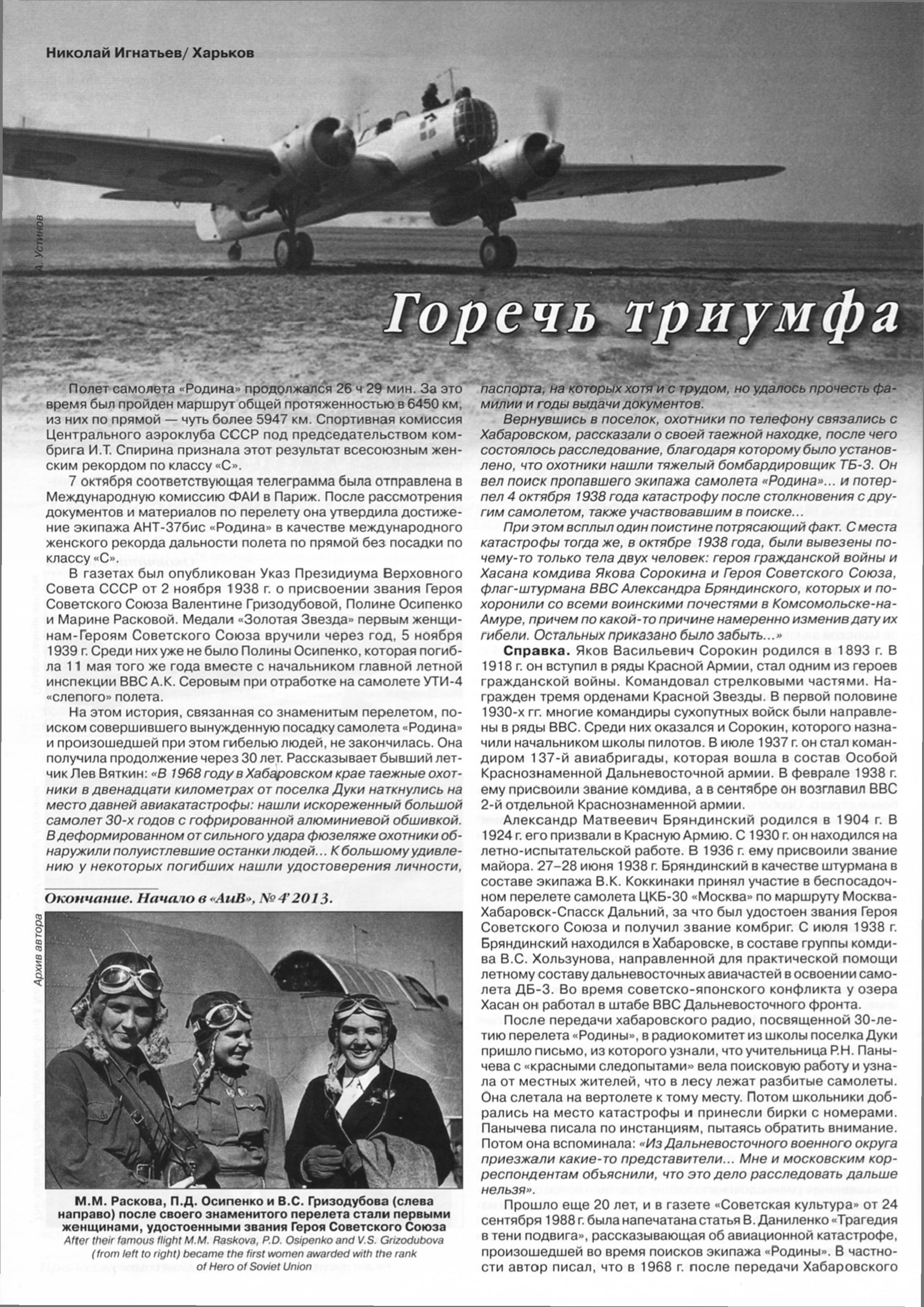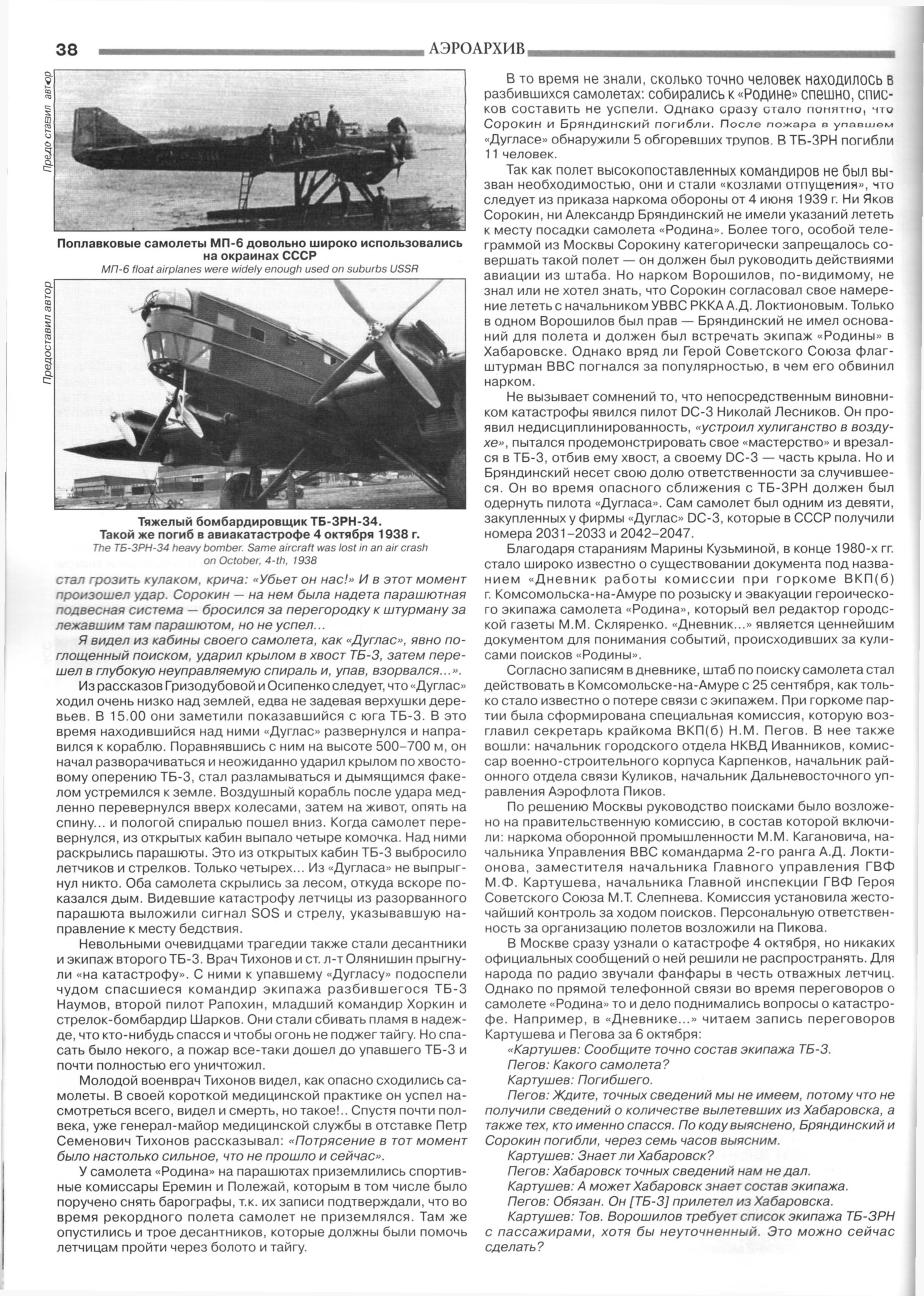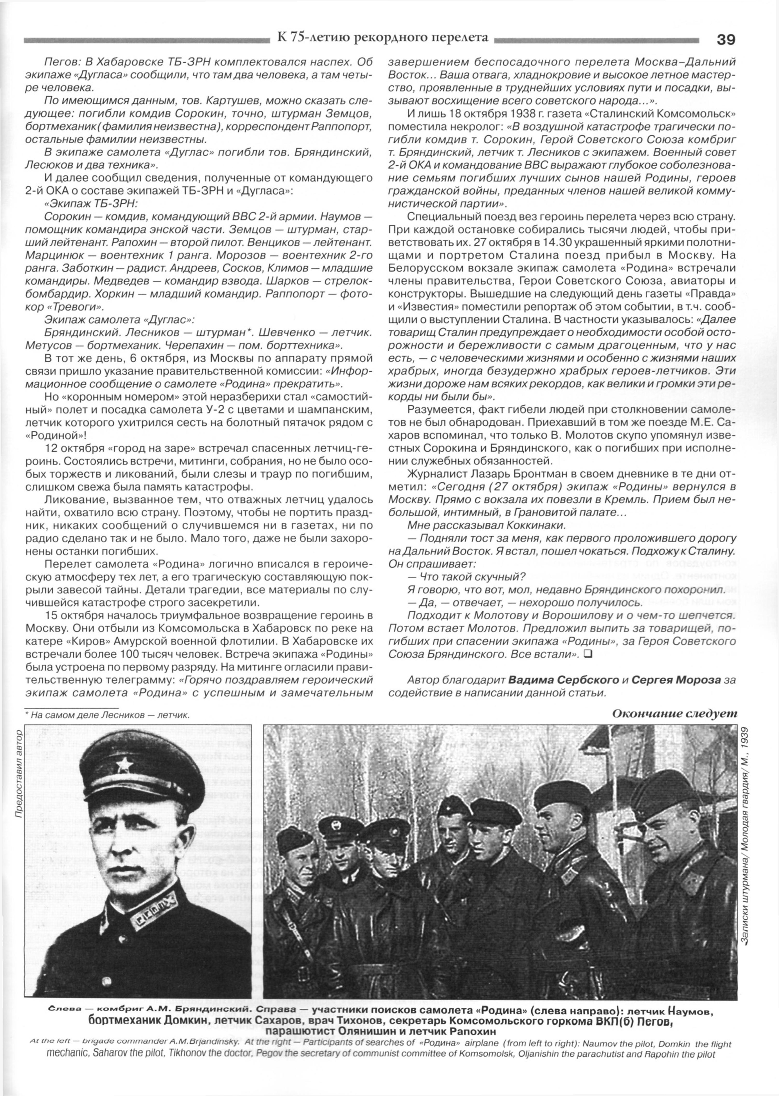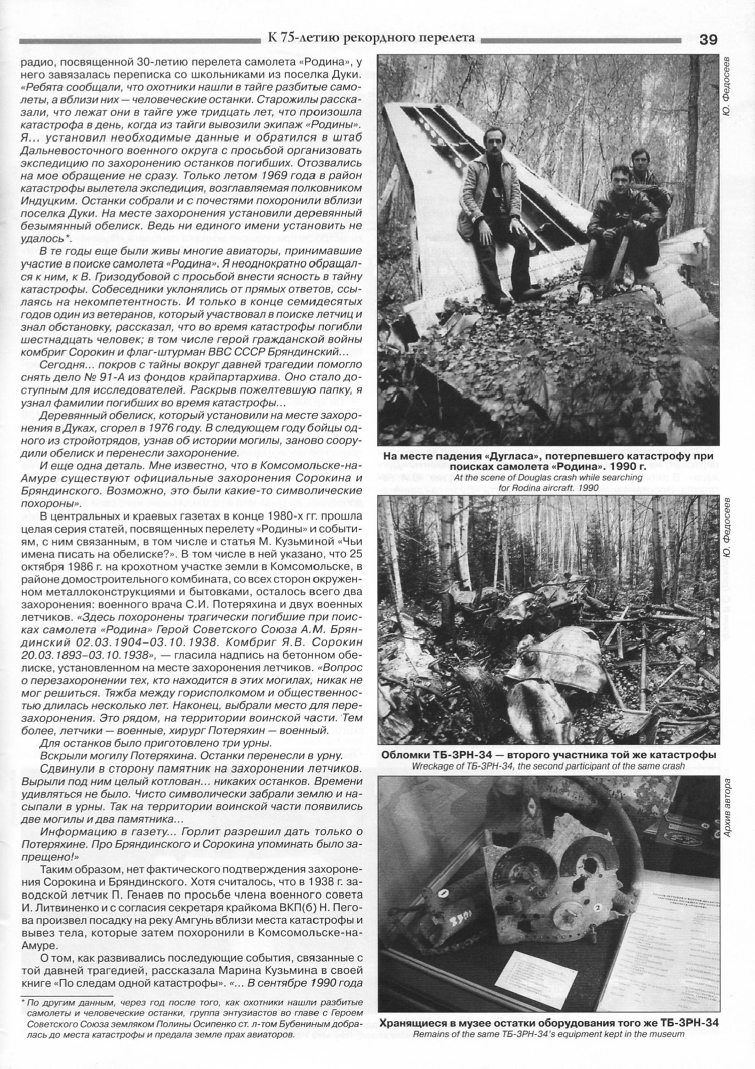 В те годы еще были живы многие авиаторы, принимавшие участие в поиске самолета «Родина». Я неоднократно обращался к ним, к В. Гризодубовой с просьбой внести ясность в тайну катастрофы. Собеседники уклонялись от прямых ответов, ссылаясь на некомпетентность. И только в конце семидесятых годов один из ветеранов, который участвовал в поиске летчиц и знал обстановку, рассказал, что во время катастрофы погибли шестнадцать человек; в том числе герой гражданской войны комбриг Сорокин и флаг-штурман ВВС СССР Бряндинский...