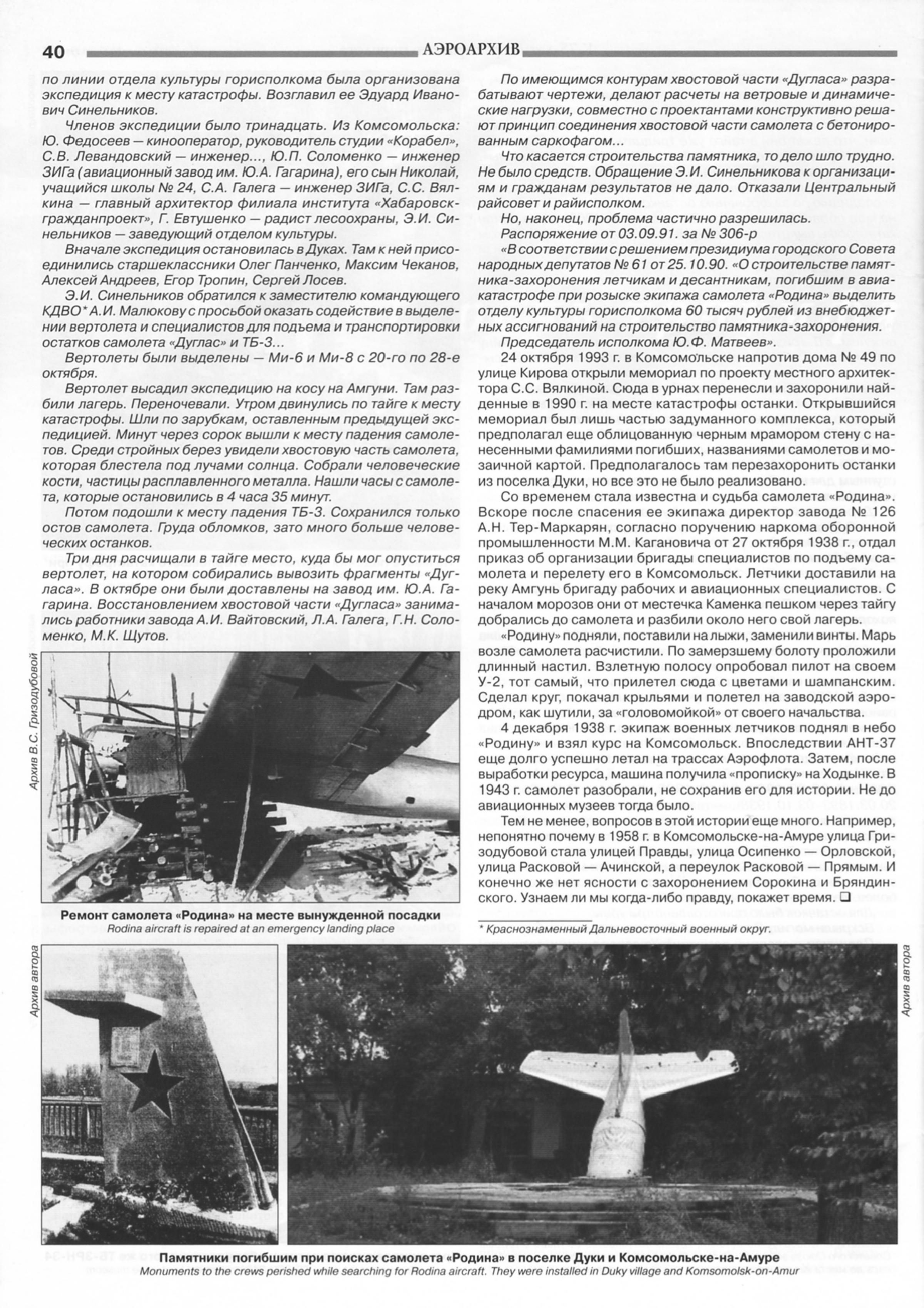 В последние дни августа 2009 г. мне удалось посетить город на берегу далекой реки Амур, где на авиационном заводе № 126 (ныне Комсомольское-на-Амуре авиационное ПО им. Ю.А. Гагарина) более 50 лет назад начинал свою инженерную деятельность. Попытка узнать подробности о судьбе захоронений двух в свое время известных в ВВС СССР людей вывела на встречу с интересным человеком М. А. Кузьминой. Она действительный член Приамурского географического общества, председатель городского комитета «Мемориал», занимается историей родного края, журналистикой. Марина Александровна любезно предоставила в мое распоряжение несколько написанных ею книг, одна из которых, «По следам одной катастрофы», и дала толчок для написания данной статьи. За что я благодарен ей.