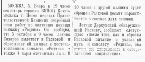 В тот же день «Правда» сообщила: «Самолет «Родина» находится в 14 километрах северо-восточнее Дуки, в пяти километрах от реки Амгунь. Для экипажа самолета сброшены горячий кофе в термосах, теплые носки, сапоги и одежда. Сбросили также карту с указанием местонахождения самолета».