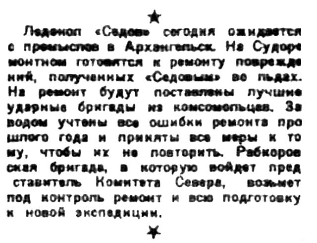 Ледокол "Седов" сегодня ожидается с промыслов в Архангельск. На Судоремонтно готовятся к ремонту повреждений, полученных "Седовым" во льдах. На ремонт будут поставлены лучшие ударные бригады из комсомольцев. Заводом учтены все ошибки ремонте прошлого года и приняты все меры к тому, чтобы их не повторить. Рабкоровская бригада, в которую войдет представитель Комитета Севера, возьмет под контроль ремонт и всю подготовку к новой экспедиции.