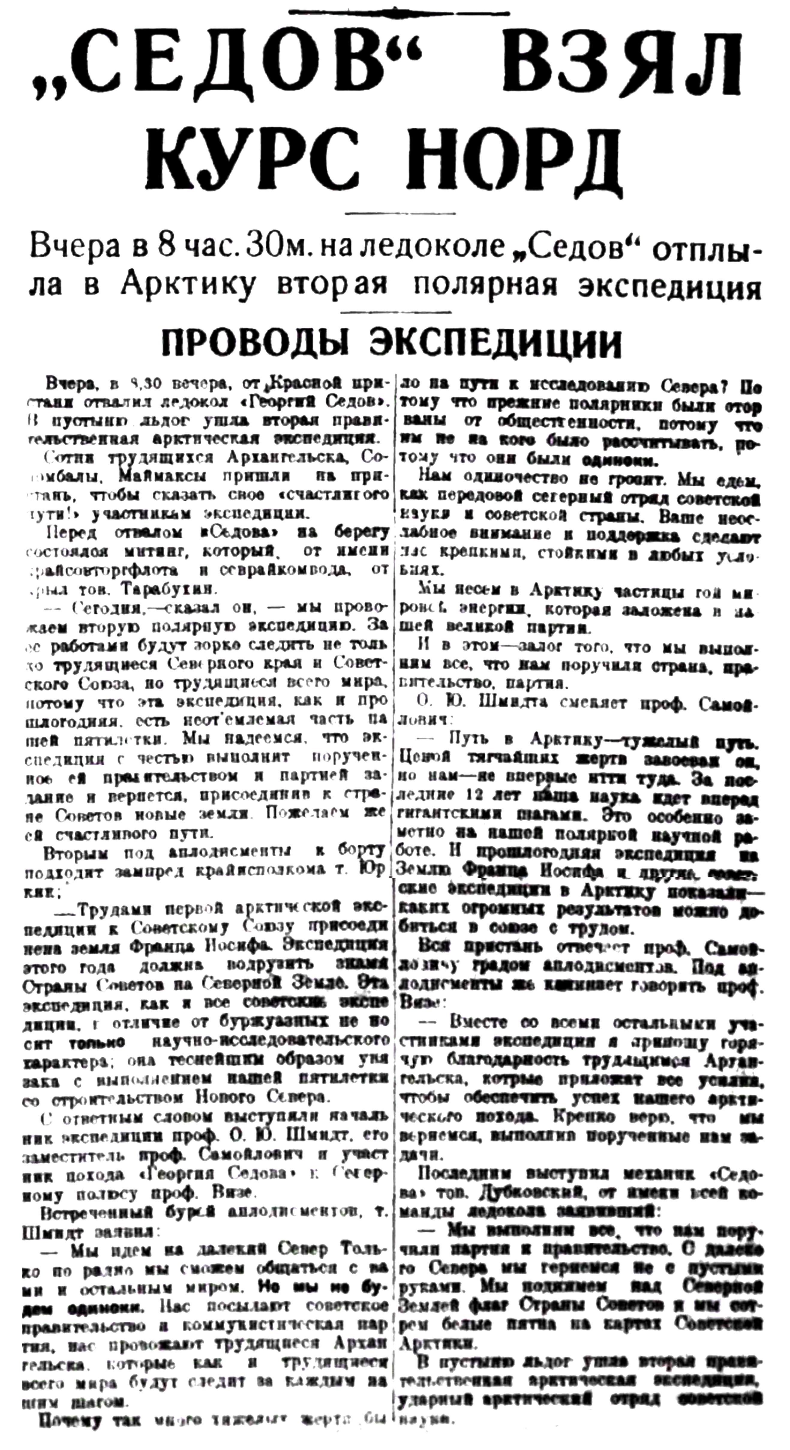 Вчера, в 8.30 вечера, от Красной пристани отвалил ледокол "Георгий Седов". В пустыню льдов ушла вторая правительственная арктическая экспедиция. Сотни трудящихся Архангельска, Соломбалы, Маймаксы пришли на пристань, чтобы сказать свое "счастливого пути! " участникам экспедиции.