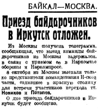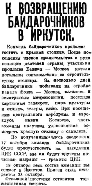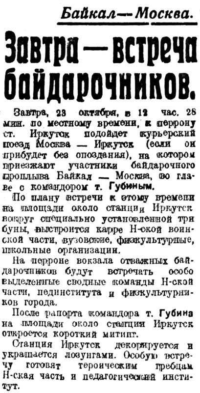 Завтра, 23 октября, в 12 час. 28 мин. по местному времени, к перрону ст. Иркутск подойдет курьерский поезд Москва — Иркутск (если он прибудет без опоздания), на котором приезжают участники байдарочного проплыва Байкал — Москва, во главе о командором т. Губиным.