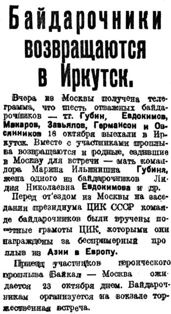 Вчера же Москвы получена телеграмма, что шесть отважных байдарочников — тт. Губин, Евдокимов, Макаров, Завьялов, Германсон и Овсянников 18 октября выехали в Иркутск. Вместе с участниками проплыва возвращаются и родные, ездившие в Москву для встречи — мать командора Марина Ильинична Губина, жена одного из байдарочников Лидия Николаевна Евдокимова и др.