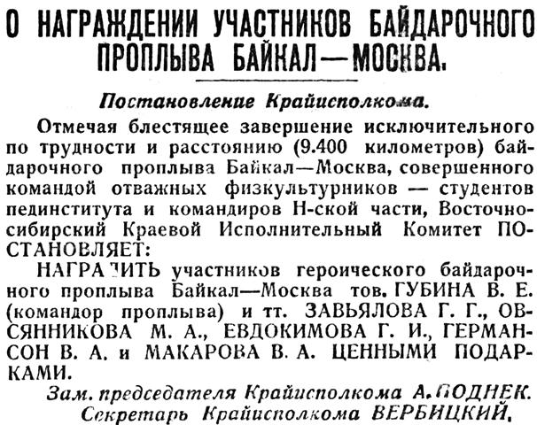 Отмечая блестящее завершение исключительного по трудности и расстоянию (9. 400 километров) байдарочного проплыва Байкал — Москва, совершенного командой отважных физкультурников — студентов пединститута и командиров Н-ской части, Восточносибирский Краевой Исполнительный Комитет ПОСТАНОВЛЯЕТ: