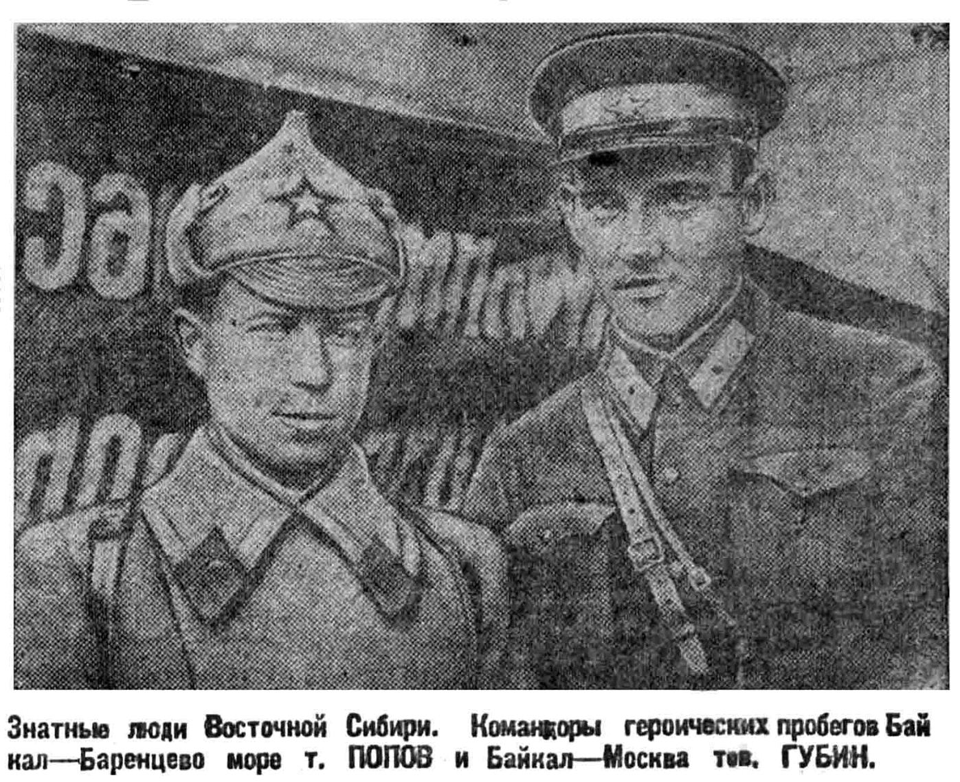 Знатные люди Восточной Сибири. Командоры героических пробегов Байкал — Баренцево море т. ПОПОВ и Байкал — Москва тов. ГУБИН.