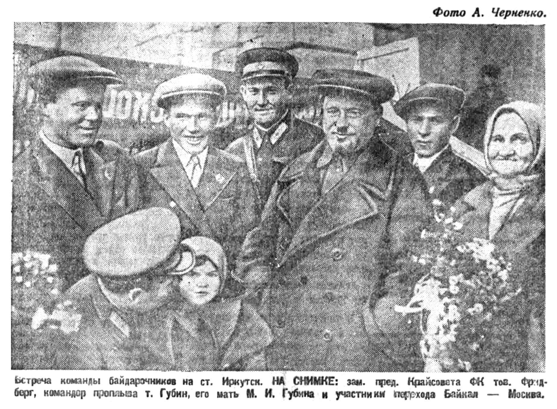 Встреча команды байдарочников на ст. Иркутск. НА СНИМКЕ: зам. пред. Крайсовета ФК тов. Фридберг, командир проплыва т. Губин, его мать М. И. Губина и участники перехода Байкал — Москва.