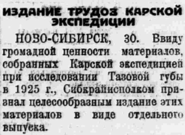 НОВО-СИБИРСК, 30. Ввиду громадной ценности материалов, собранных Карской экспедицией при исследовании Тазовской губы в 1925 г., Сибкрайисполком признал целесообразным издание этих материалов в виде отдельного выпуска.