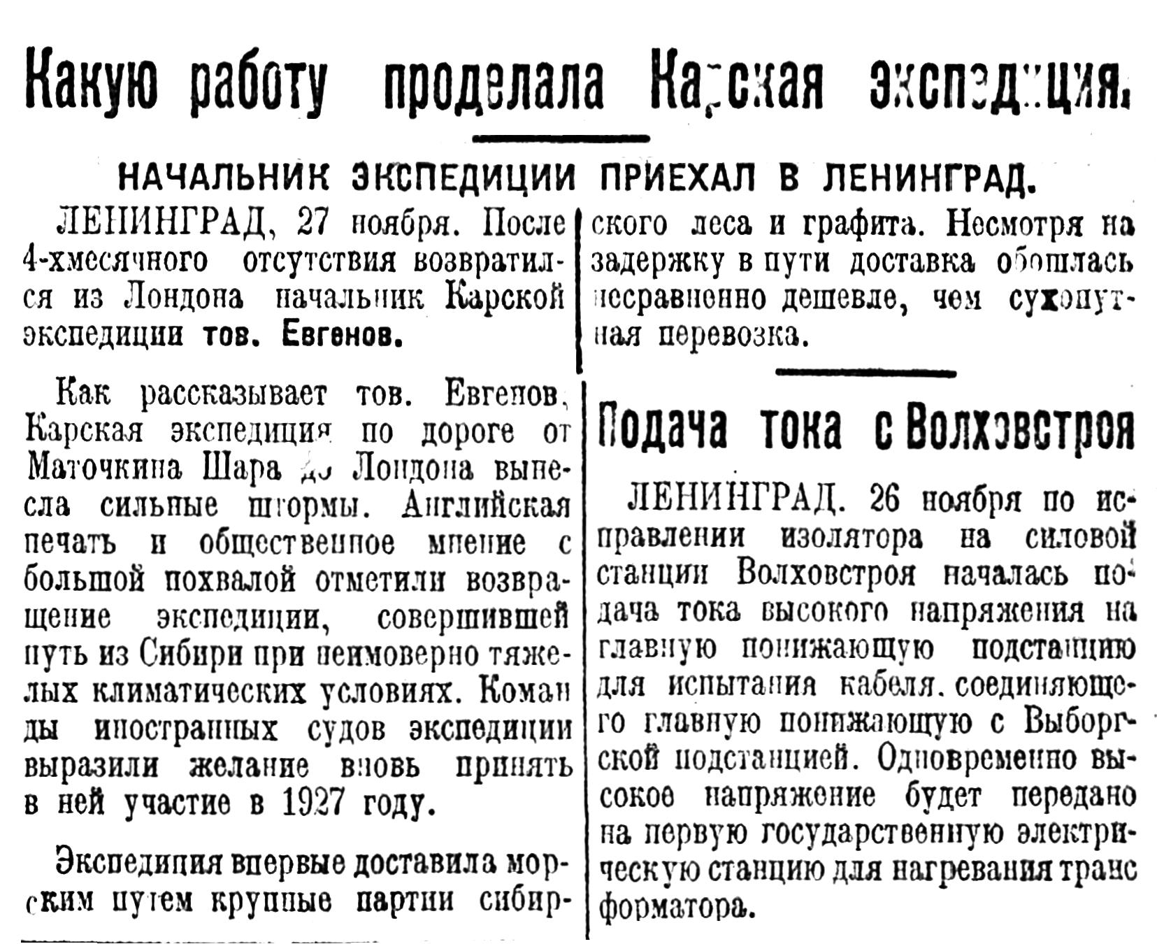 Как рассказывает тов. Евгенов, Карская экспедиция по дороге от Маточкина Шара до Лондона вынесла сильные штормы. Английская печать и общественное мнение с большой похвалой отметили возвращение экспедиции, совершившей путь из Сибири при неимоверно тяжелых климатических условиях. Команды иностранных судов экспедиции выразили желание вновь принять в ней участие в 1927 году.