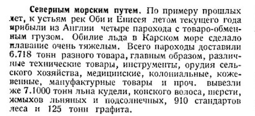 Экспедиция впервые доставила морским путем крупные партии сибирского леса и графита. Несмотря на задержку в пути доставка обошлась несравненно дешевле, чем сухопутная перевозка.