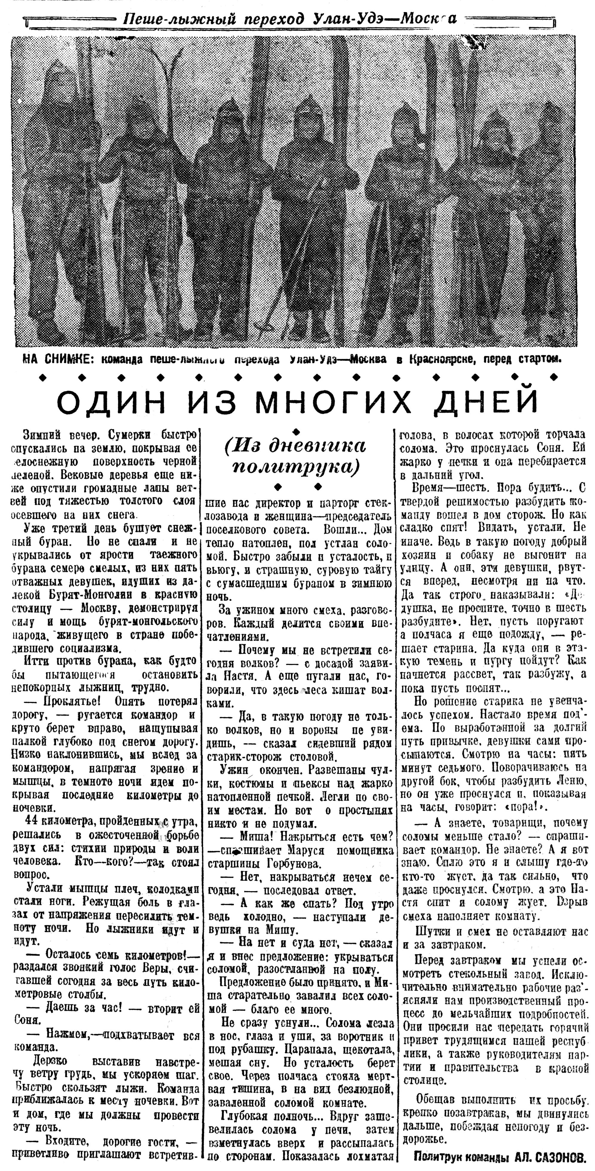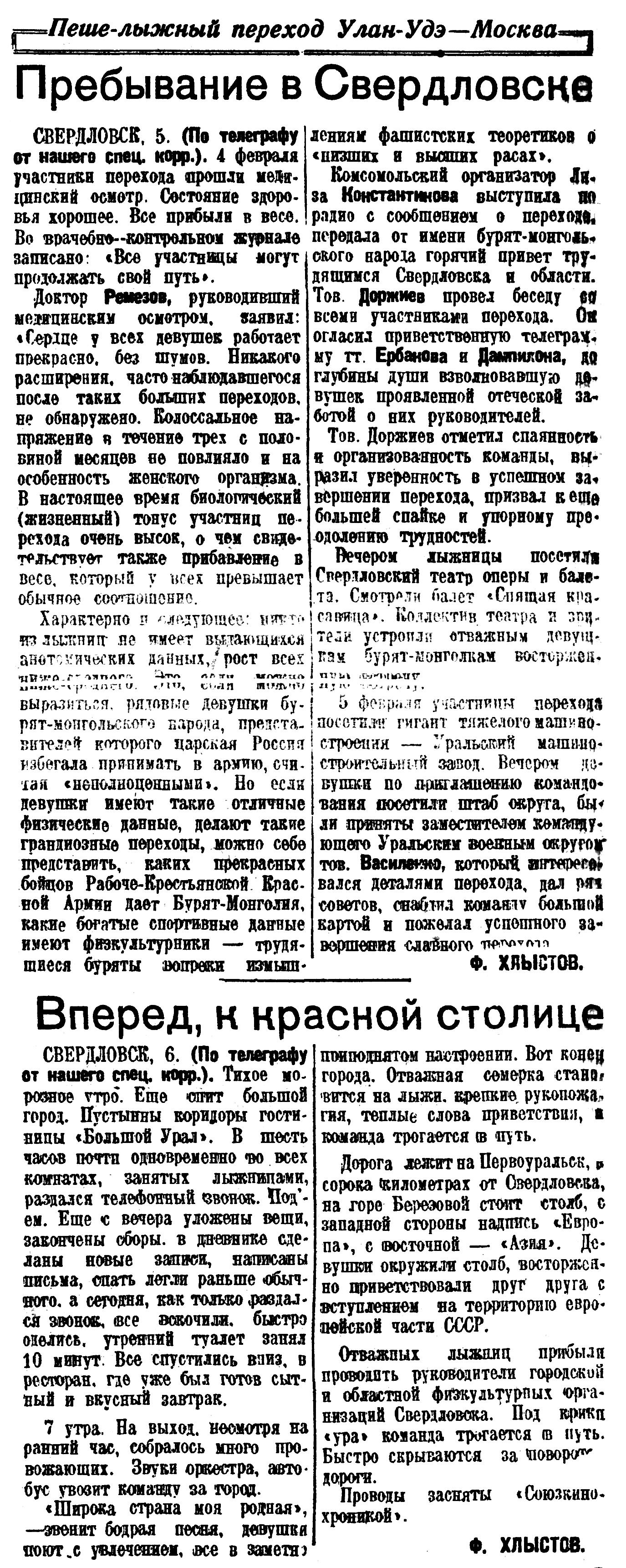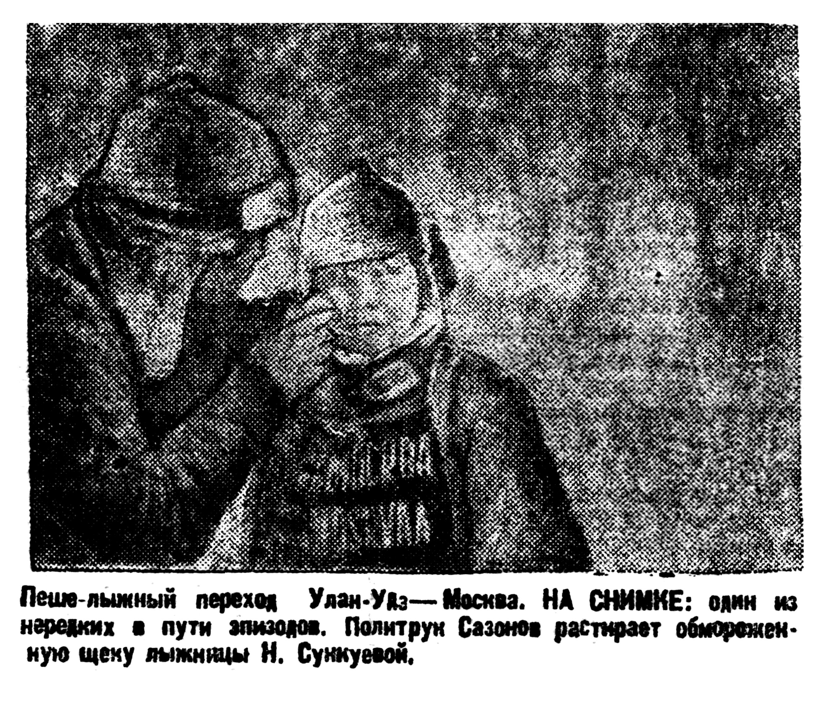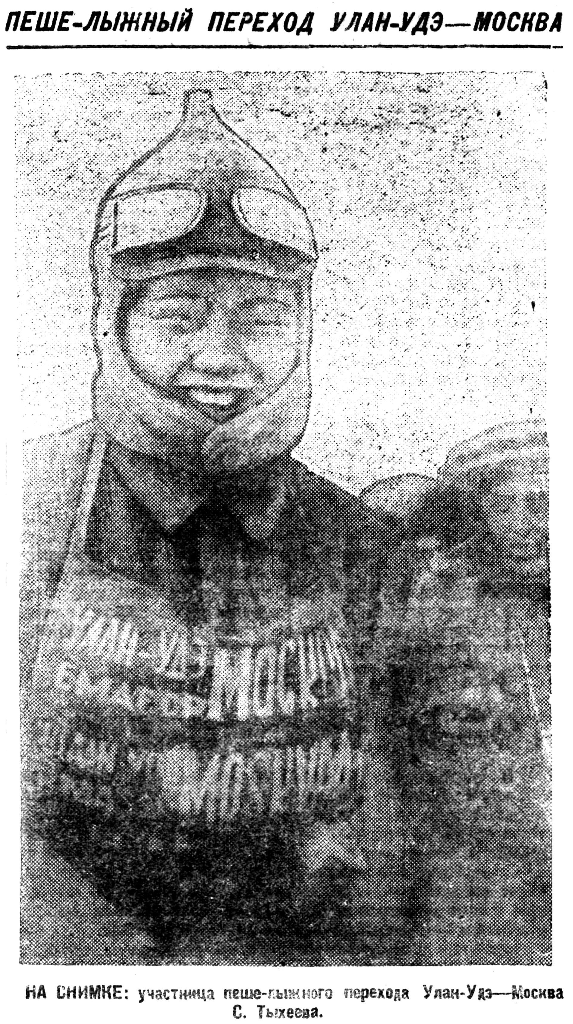 Характерно и следующее: никто из лыжниц не имеет выдающихся анатомических данных, рост всех ниже среднего. Это, если можно выразиться. рядовые девушки бурят-монгольского народа, представителей которого царская Россия избегала принимать в армию, считая «неполноценными». Во если девушки имеют такие отличные физические данные, делают такие грандиозные переходы, можно себе представить, каких прекрасных бойцов Рабоче-Крестьянской Красной Армии дает Бурят-Монголия, какие богатые спортивные данные имеют физкультурники — трудящиеся буряты вопреки измышлениям фашистских теоретиков о «низших и высших расах».