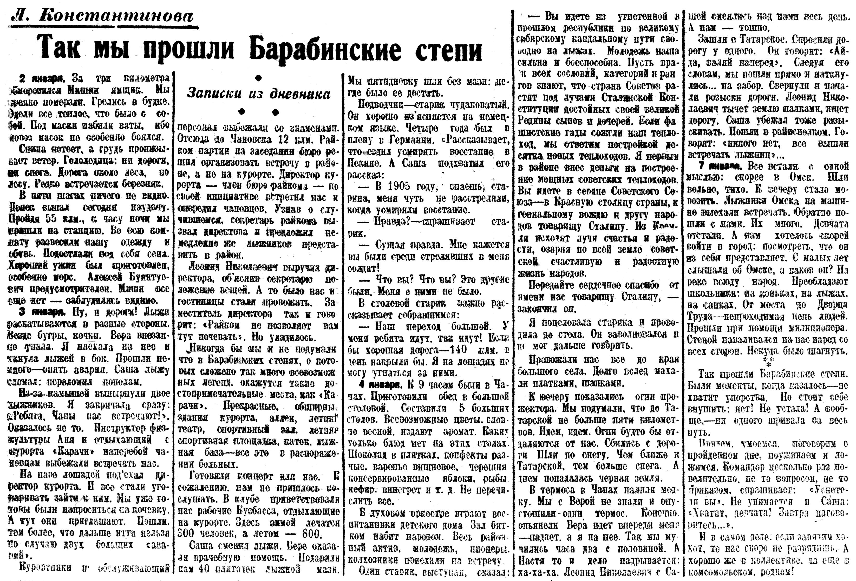 27 декабря. С трудом разыскали дорогу. Ветер не стихает, сбивает с ног. Я всматриваюсь все вперед. Думаю — что это за аккуратно сложенные стога? Однако прошли километр, из кажущихся стогов вырос большой совхоз. Не верила глазам, когда передо мной предстали маленькие белые, вымазанные глиной, дома. Пообедали у председателя сельсовета.