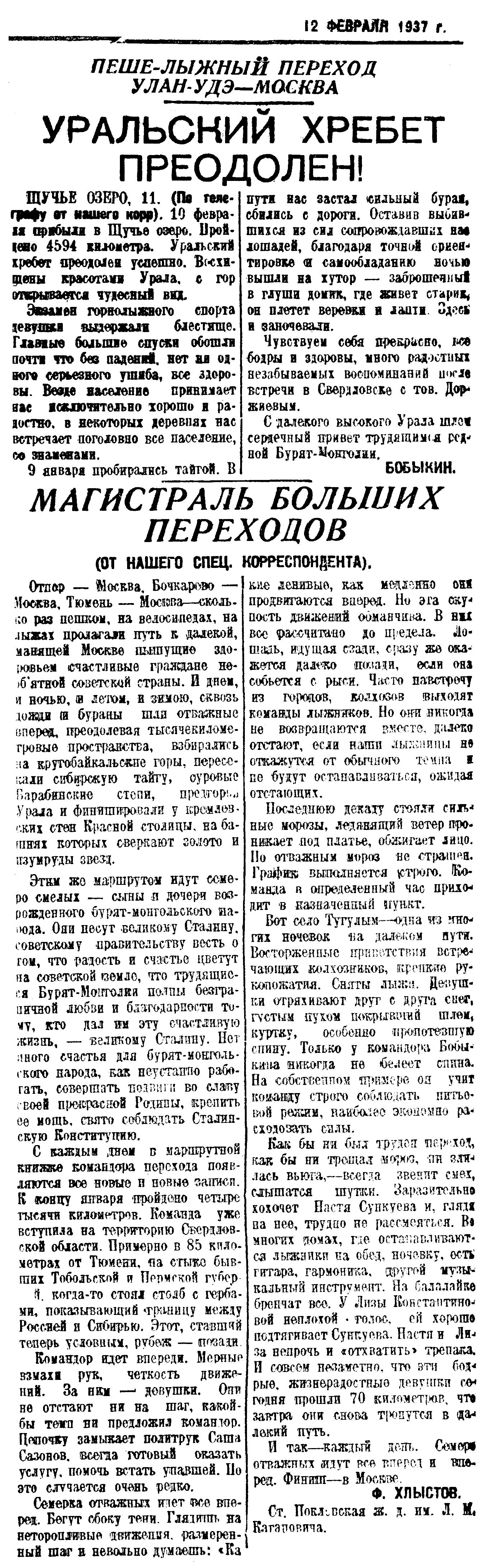 1936-1937: Лыжно-пеший переход Улан-Удэ — Москва — 6065 км.