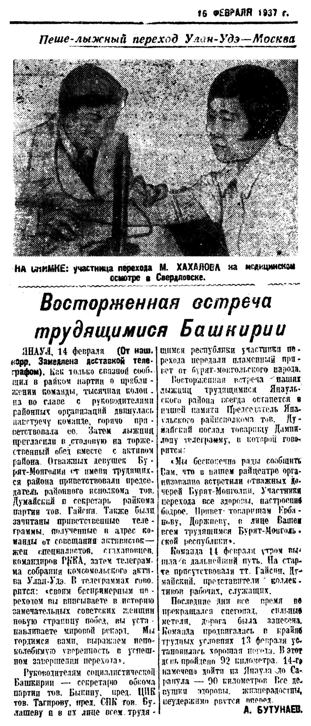 21 февраля были на приеме правительства Татарии. Дружески, непринужденно беседовали с орденоносным руководителем Татарии председателем Совнаркома тов. Абрамовым. Девушка живо интересовались ростом социалистической культуры орденоносной Татарии. В Казани прошли врачебный консилиум, состояние здоровья отличное, бодры, здоровы, готовы в дальнейший путь. Искренний сердечный привет от всей команды трудящимся нашей родной Бурят-Монголии.