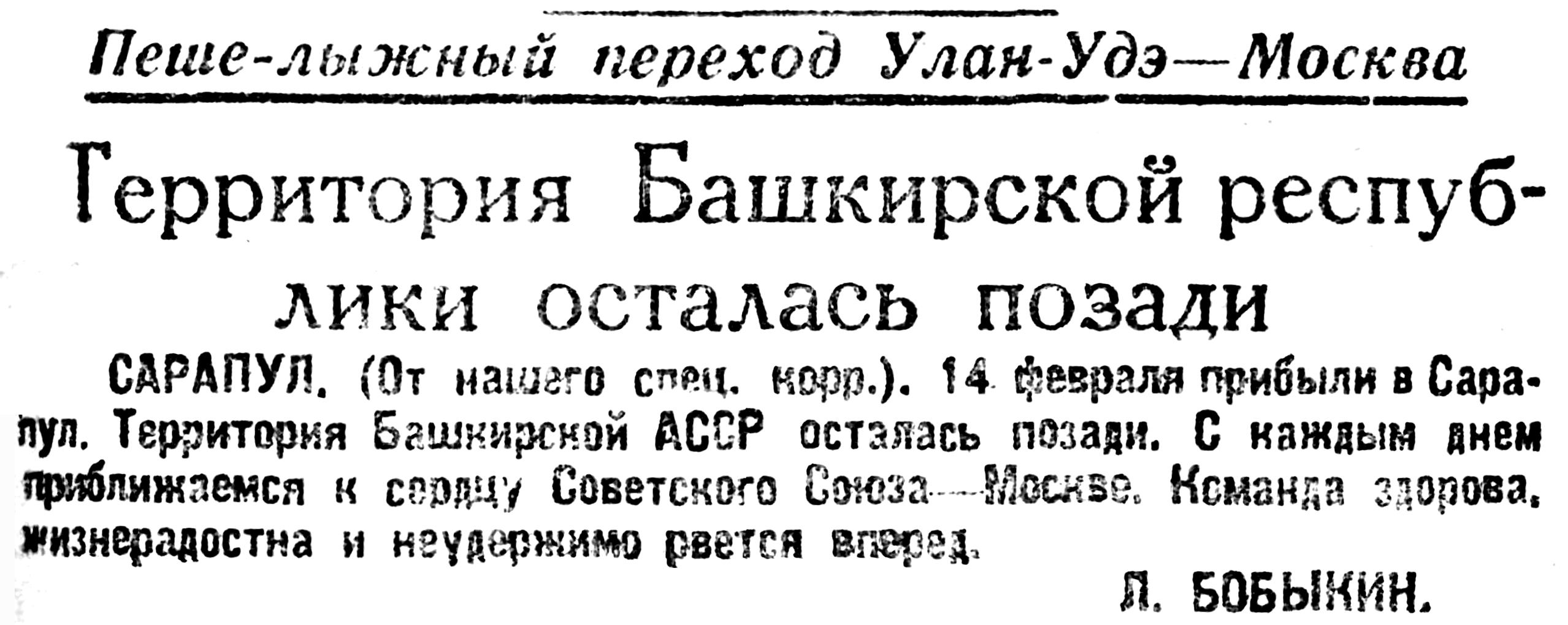 Последние дни все время не прекращался снегопад, сильные метели, дорога была занесена. Команда продвигалась в крайне трудных условиях. 13 февраля установилась хорошая погода. В этот день пройдено 92 километра. 14-го намечено дойти из Янаула до Сарапула — 90 километров. Все девушки здоровы, жизнерадостны, неудержимо рвутся вперед.