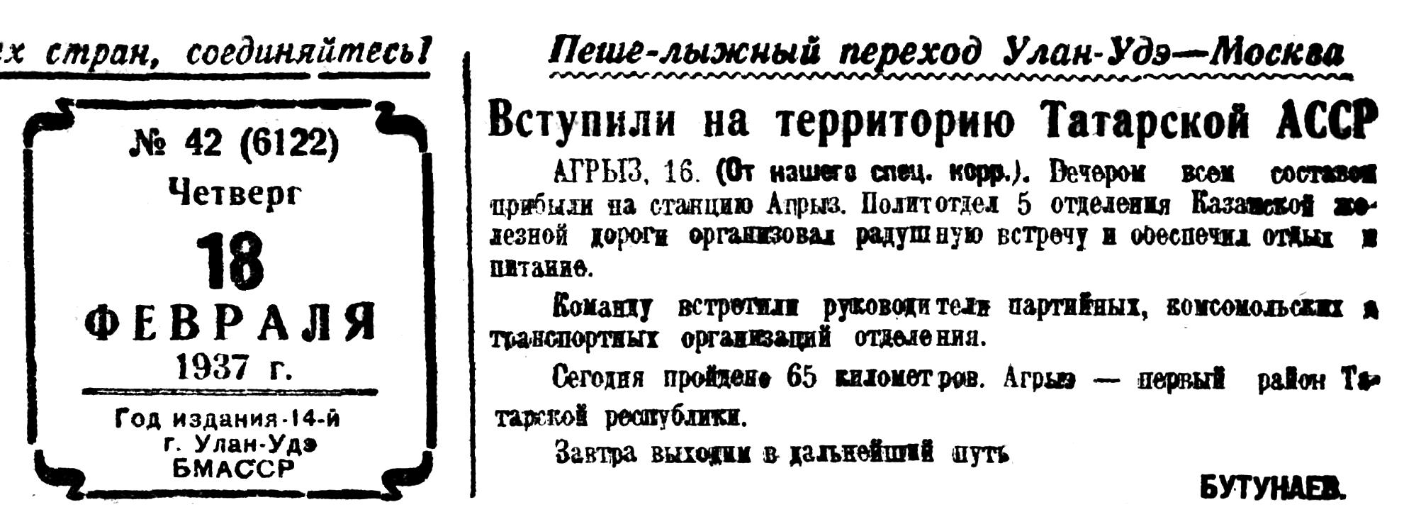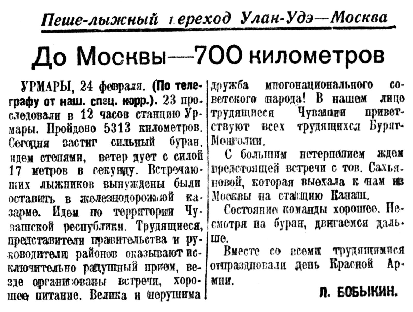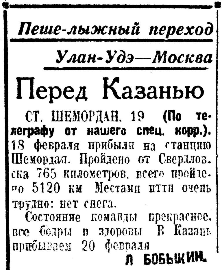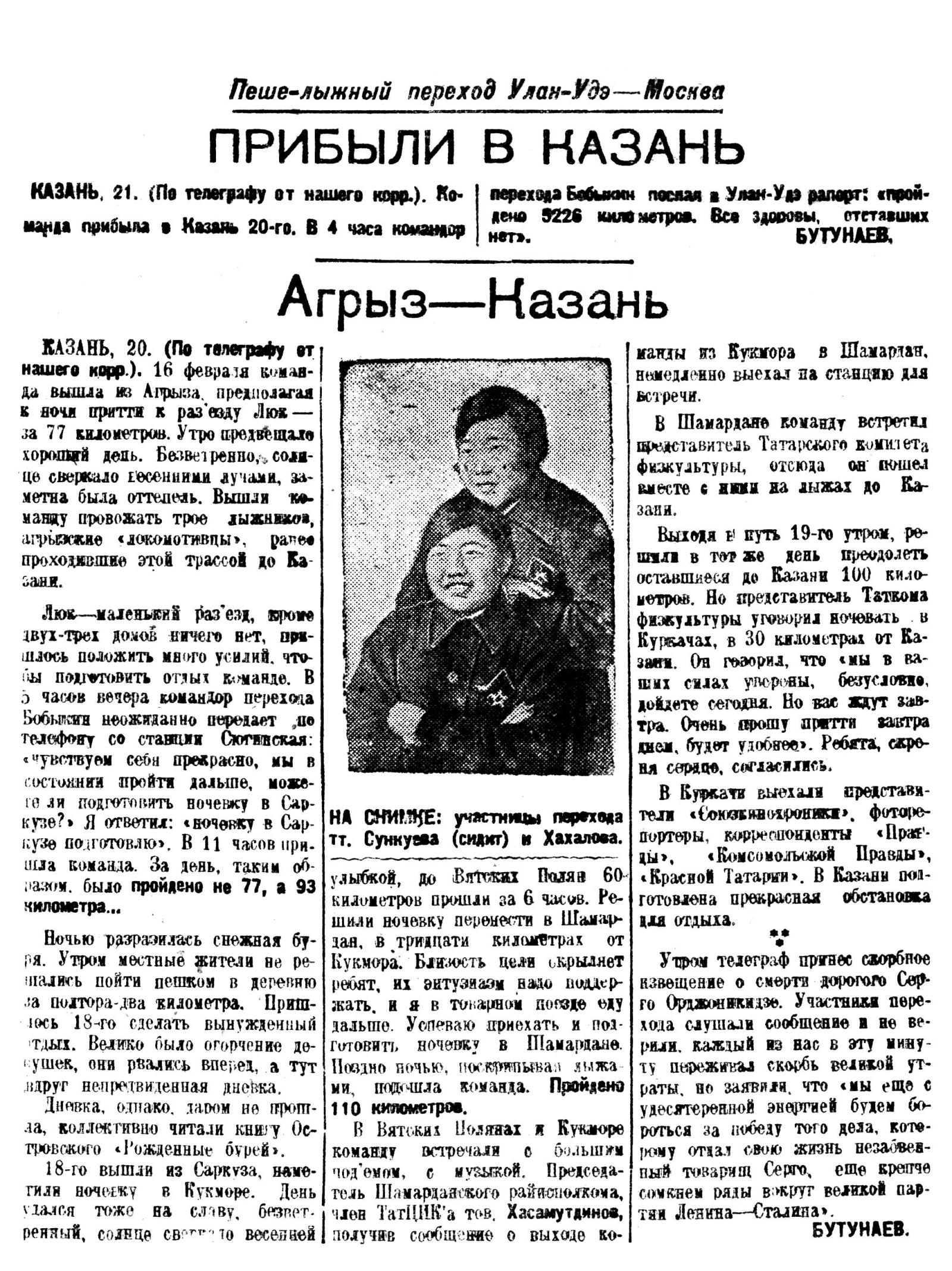 Boт и Казань. Трудящиеся столицы Татарин восторженно встретит команду. На трибуне, на площади Свободы представители ЦИК обкома партии, комсомола, торжественно гремит музыка. Командор тов. Бобыкин рапортует: «Команда лыжного перехода Улан-Удэ — Москва прибыла в Казань. Пройдено 5226 километров. Все здоровы, отставших нет. Привет правительству и трудящимся Татарии». Сердечное рукопожатие, затем начались расспросы о пройденном пути.