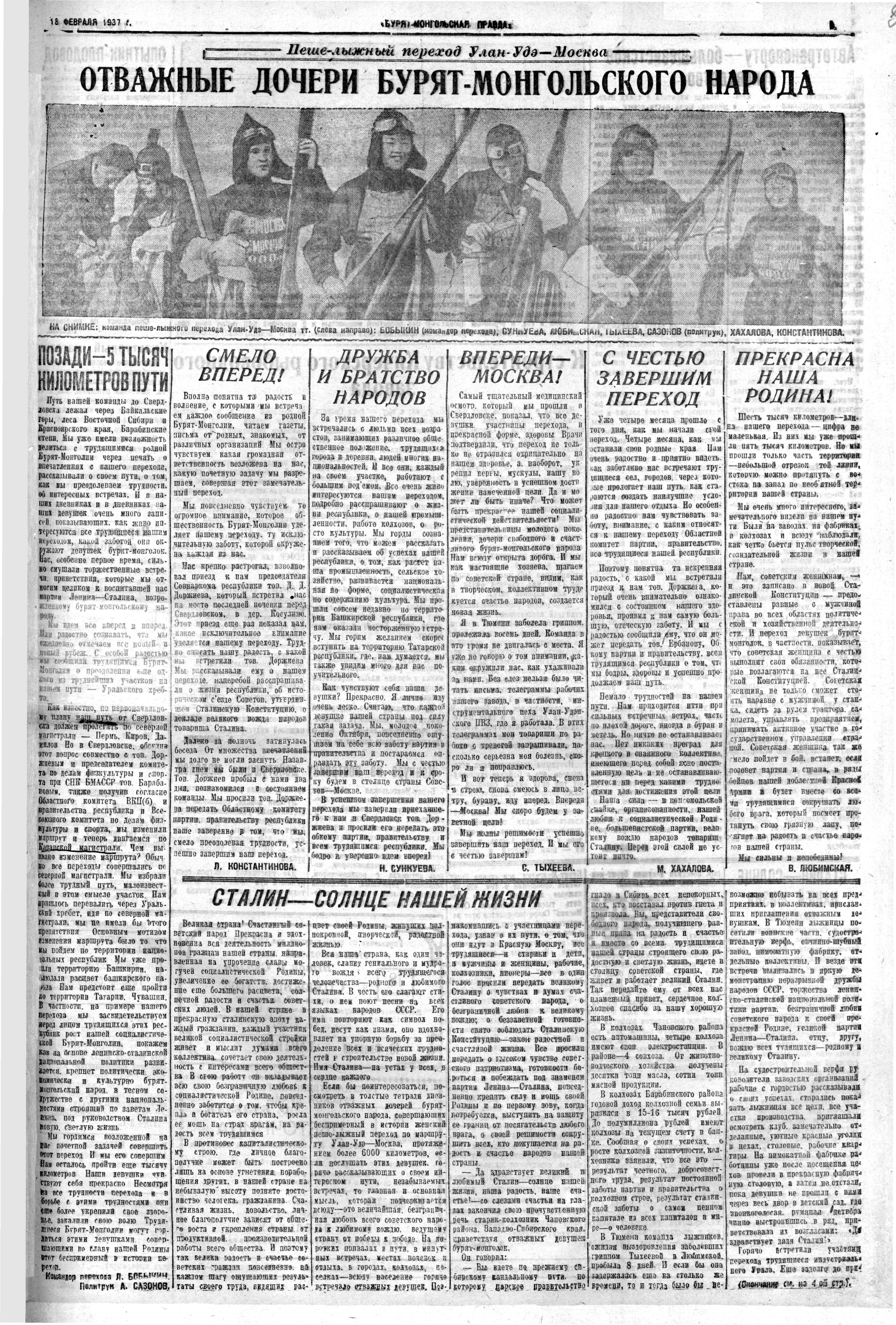 «Мы бесконечно рады сообщить Вам, что в нашем райцентре организованно встретили отважных дочерей Бурят-Монголии. Участники перехода все здоровы, настроение бодрое. Привет товарищам Ербанову, Доржиеву, в лице Вашем всем трудящимся Бурят-Монгольской республики».