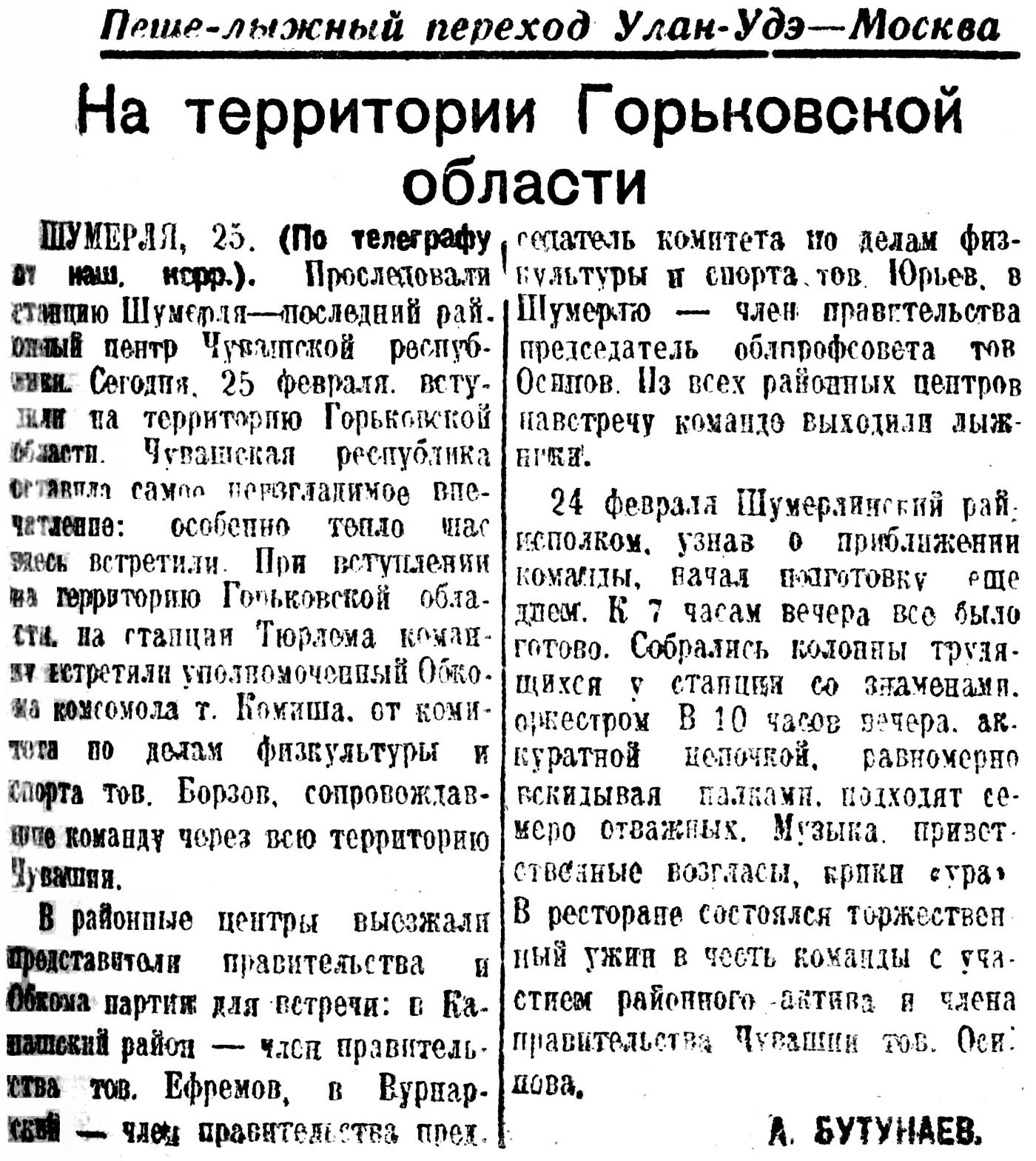 В районные центры выезжали представители правительства и Обкома партии для встречи: в Канашский район — член правительства тов. Ефремов, в Вурнарский — член правительства председатель комитета по делам физкультуры и спорта тов. Юрьев, в Шумерлю — член правительства председатель облпрофсовета тов. Осипов. Из всех районных центров навстречу команда выходили лыжники.