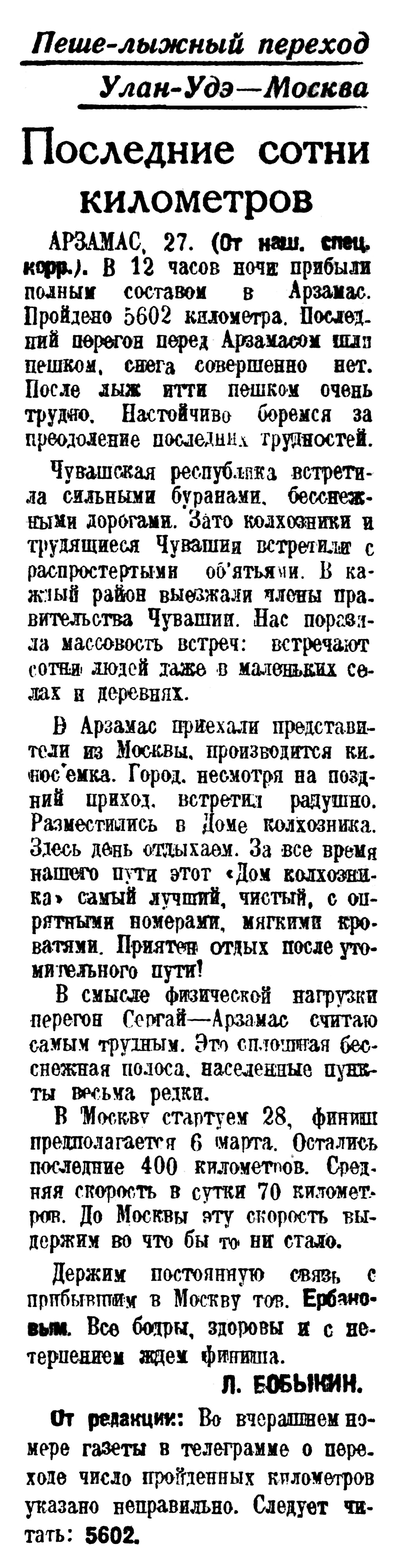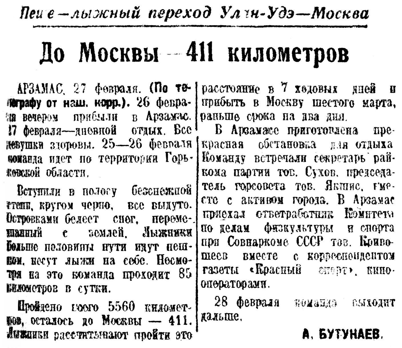 В Москву стартуем 28, финиш предполагается 6 марта. Остались последние 400 километров. Средняя скорость в сутки 70 километров. До Москвы эту скорость выдержим во что бы то ни стало. Держим постоянную связь с прибывшим в Москву тов. Ербановым. Все бодры, здоровы и с нетерпением ждем финиша.