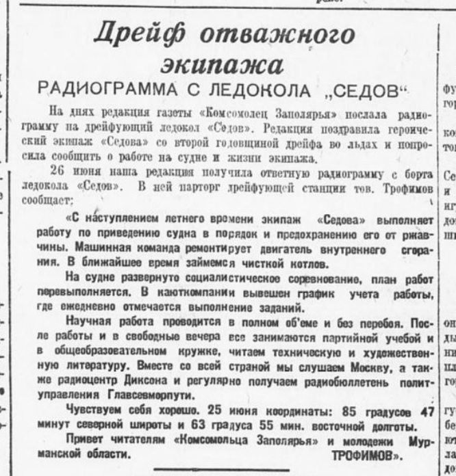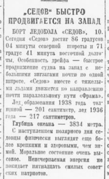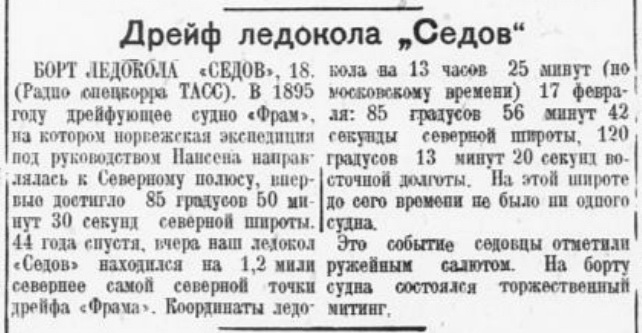 БОРТ ЛЕДОКОЛА «СЕДОВ», 18. (Радио спецкорра ТАСС). В 1895 году дрейфующее судно «Фрам». на котором норвежская экспедиции под руководством Нансена направлялась к Северному полюсу, впервые достигло 85 градусов 50 минут 30 секунд северной широты. 44 года спустя, вчера наш ледокол «Седов» находился на 1,2 мили севернее самой северной точки дрейфа «Фрама». Координаты ледокола на 13 часов 25 минут (по московскому времени) 17 февраля: 85 градусов 56 минут 42 секунды северной широты, 120 градусов 13 минут 20 секунд восточной долготы. На этой широте до сего времени не было ни одного судна.