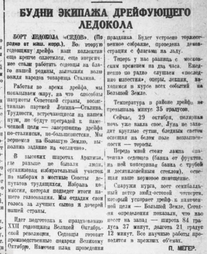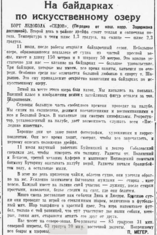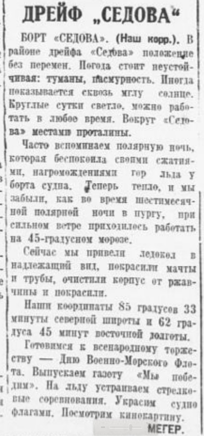 С наступлением полярного дня седовцы физически выглядят еще более крепкими и здоровыми, чем зимой. Моральное состояние очень высокое. Неисчерпаемая энергия не покидает пятнадцать смелых советских патриотов.