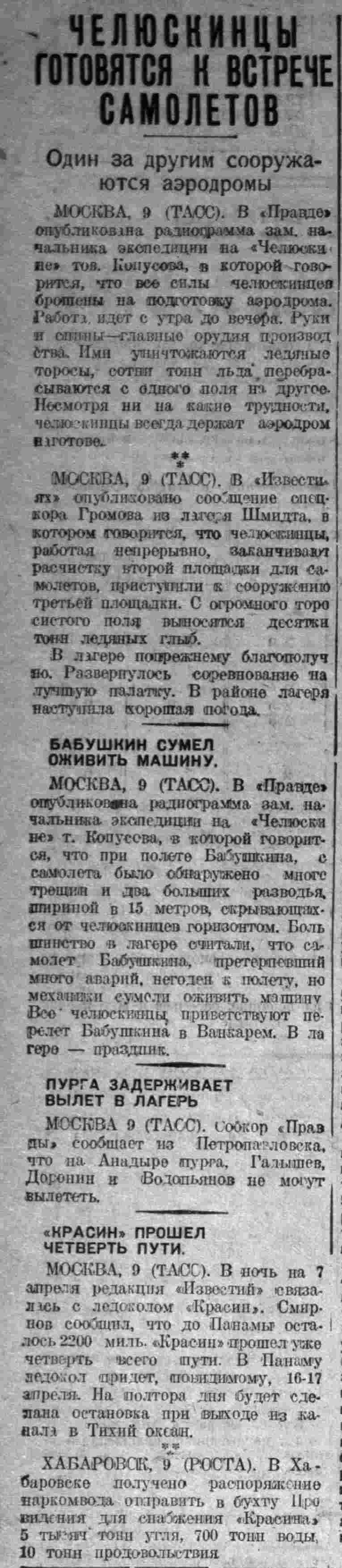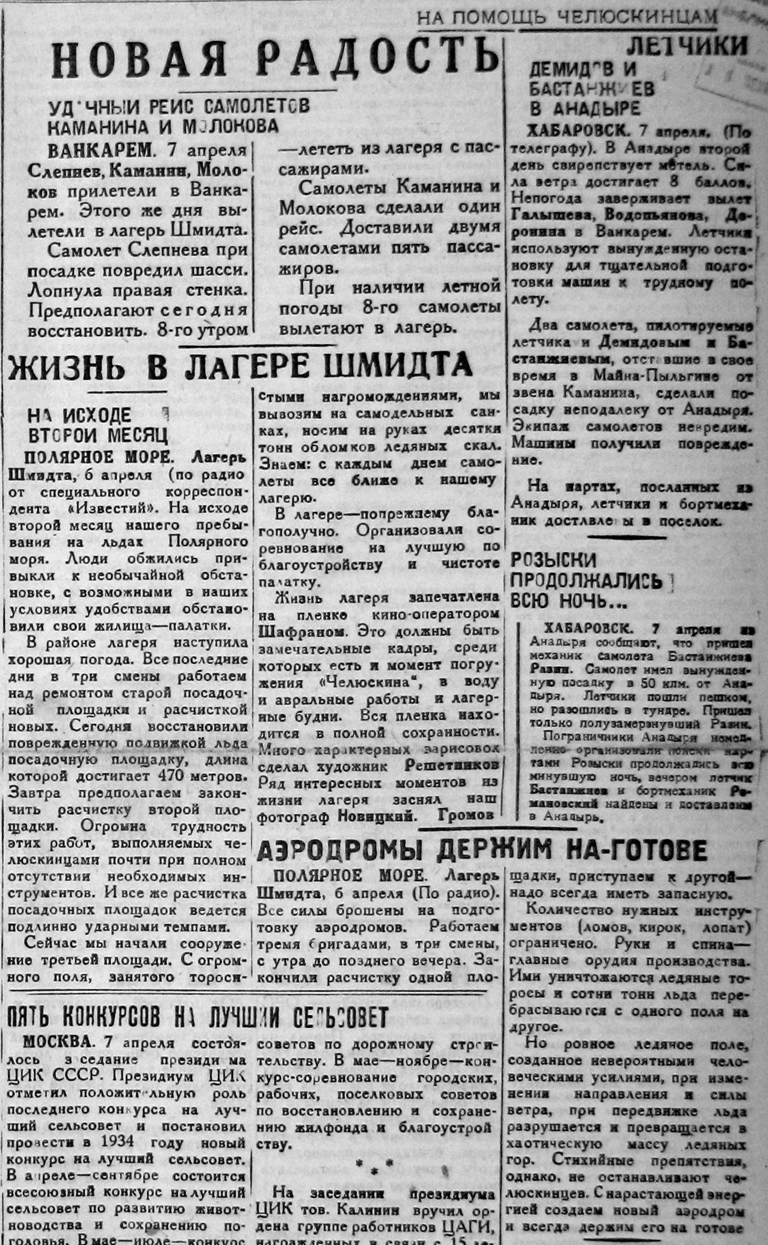 Обстановка, в лагере челюскинцев 7, 8 и 9 числа красочно описана Ушаковым (смотрите помещенную сегодня телеграмму от 10 апреля).