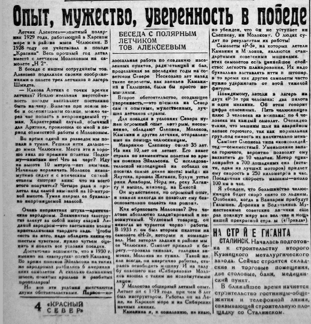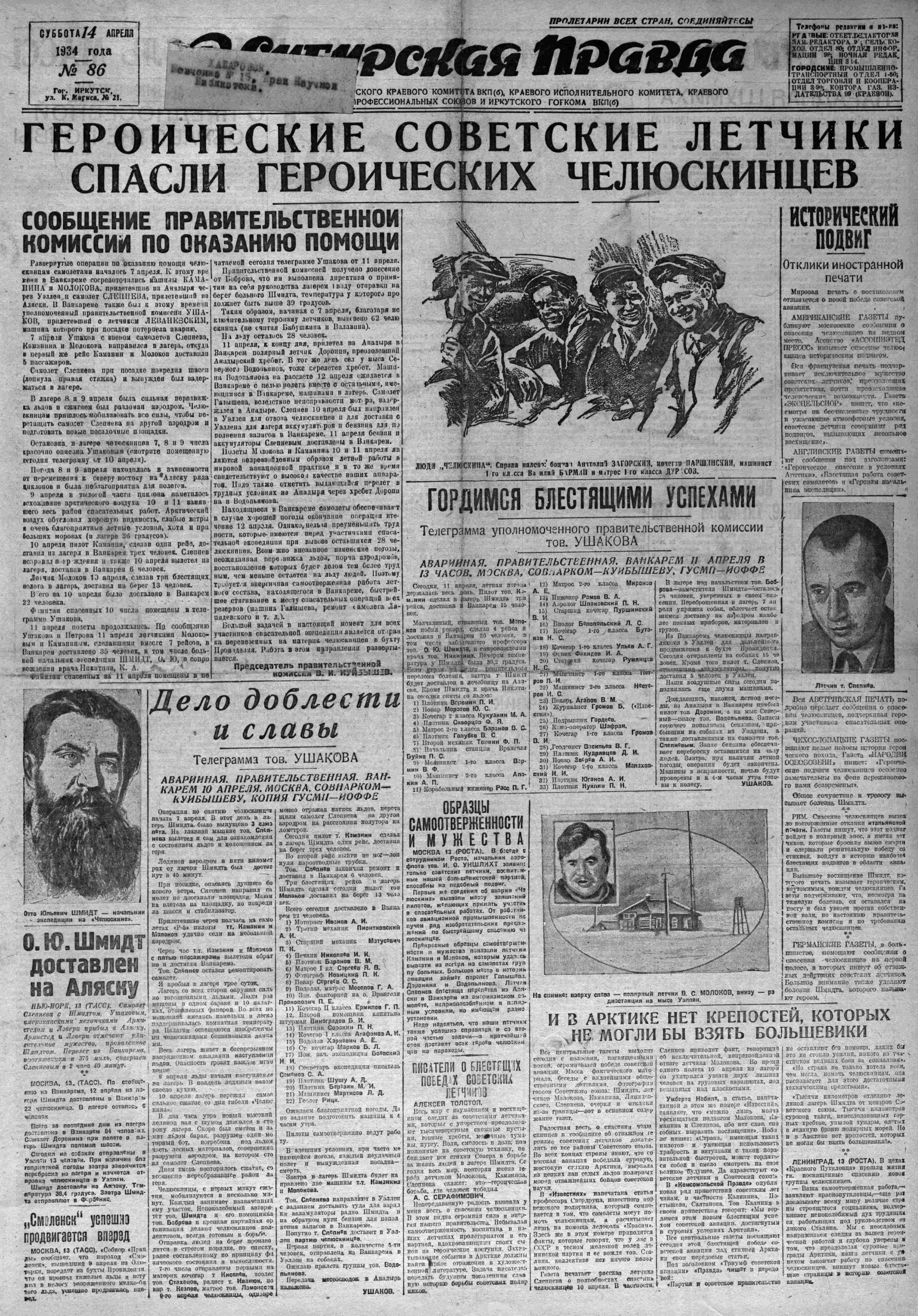 О. Ю. Шмидт доставлен на АляскуНЬЮ-ЙОРК, 13 (ТАСС). Самолет Слепнева с Шмидтом, Ушаковым, американскими механиками Армистедом и Лэвери прибыл в Аляску. Армистед и Лзвери отмечают удивительное мужество, проявленное Шмидтом. Перелет из Ванкарема, протяжением в 375 миль, совершен Слепневым в 2 часа 40 минут.
