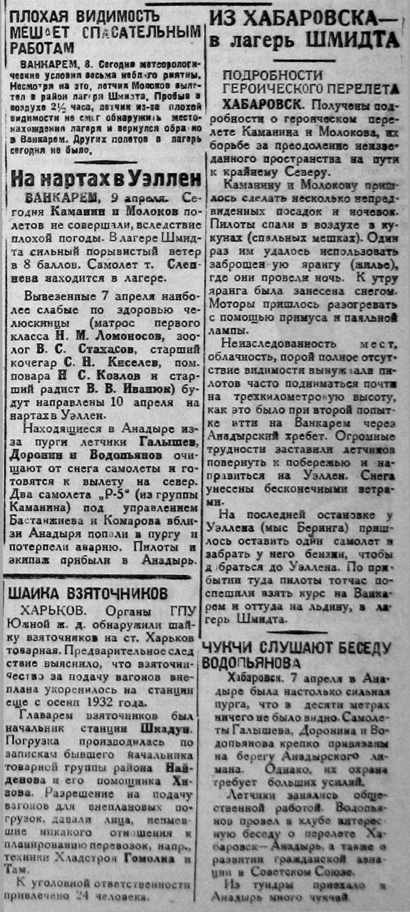 Дождавшись, наконец, летной погоды, из Анадыря в Ванкарем прибыл пилот тов. Доронин, а на мыс Северный — пилот тов. Водопьянов. Запасы горючего пополнены бензином, прибывшим на собаках из Уэллена, а также доставленным на самолета тов. Слепневым. Запас бензина обеспечивает переброску оставшихся на льду людей. Завтра, при наличии летной погоды, операция будет закончена. Машины в исправности, ночыо будут проверены и к 4-м часам утра готовы к полету.