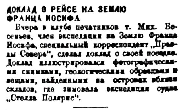 Вчера в клубе печатников т. Мих. Весеньев, член экспедиции на Землю Франца Иосифа, специальный корреспондент "Правды Севера", сделал доклад о своей поездке. Доклад иллюстрировался фотографическими снимками, геологическими образцами и вещами, найденными на островах вблизи складов, где зимовала экспедиция судна "Стелла Полярис".