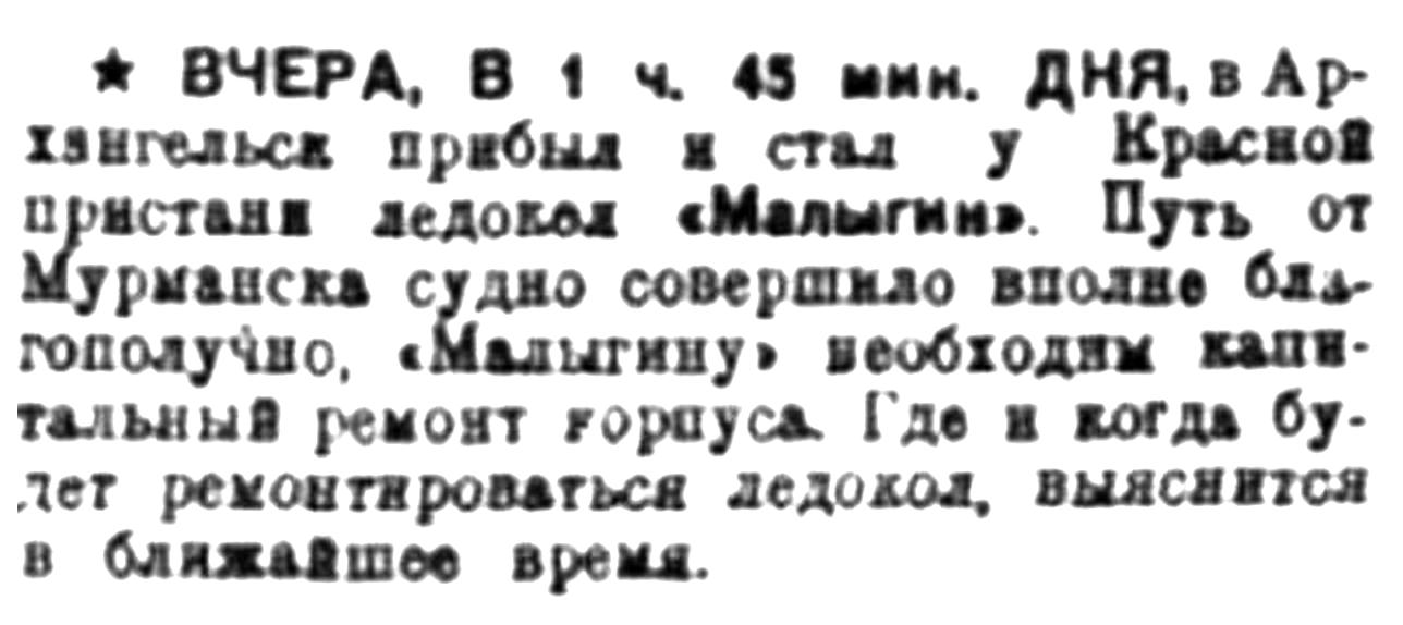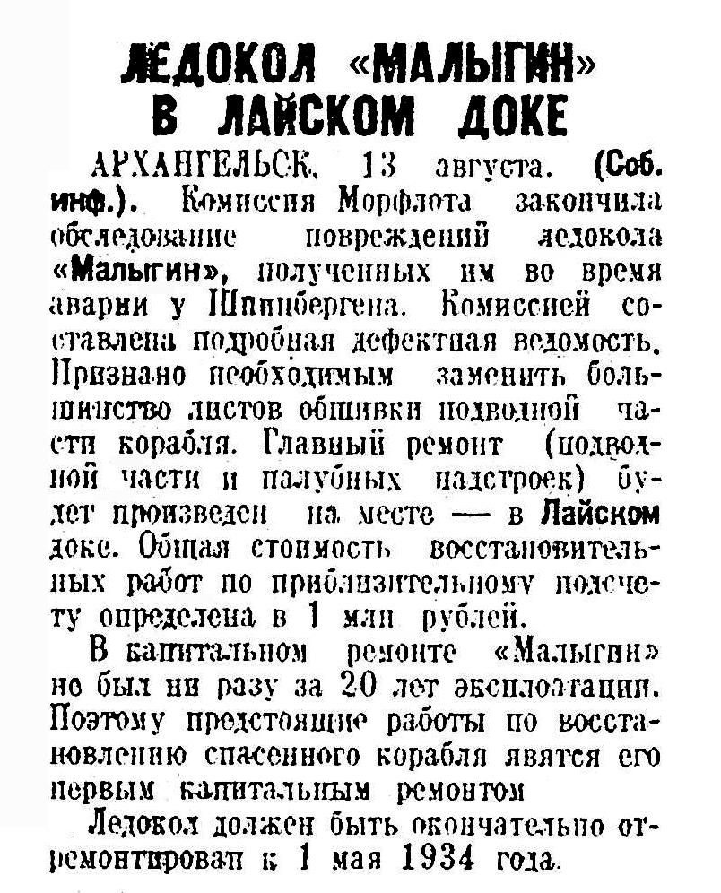 Правда Севера, 1933, № 179, 5 августа"МАЛЫГИН" В ЛАЙСКОМ ДОКЕДля ремонта приглашаются котельщики из ГорькогоЗакончено обследование повреждений ледокола "Малыгин", полученных во время аварии на Шпицбергене. Морфлотом составлена дефектная ведомость. По приблизительному подсчету, на ремонт "Малыгина" потребуется затратить около 1 милл. рублей. Необходимо сказать, что за все время плаваний, т. е. в течение 20 лет, "Малыгин" не был в капитальном ремонте. Предстоящий ремонт будет первым капитальным ремонтом ледокола. Основная работа — ремонт подводной части.