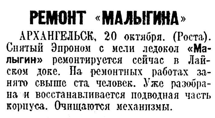 Соб. инф.). Комиссия Морфлота закончила обследование повреждений ледокола «Малыгин», полученных им во время аварии у Шпицбергена. Комиссией составлена подробная дефектная ведомость. Признано необходимым заменить большинство листов обшивки подводной части корабля. Главный ремонт (подводной части и палубных надстроек) будет произведен на месте — в Лайском доке. Общая стоимость восстановительных работ по приблизительному подсчету определена в 1 млн рублей.