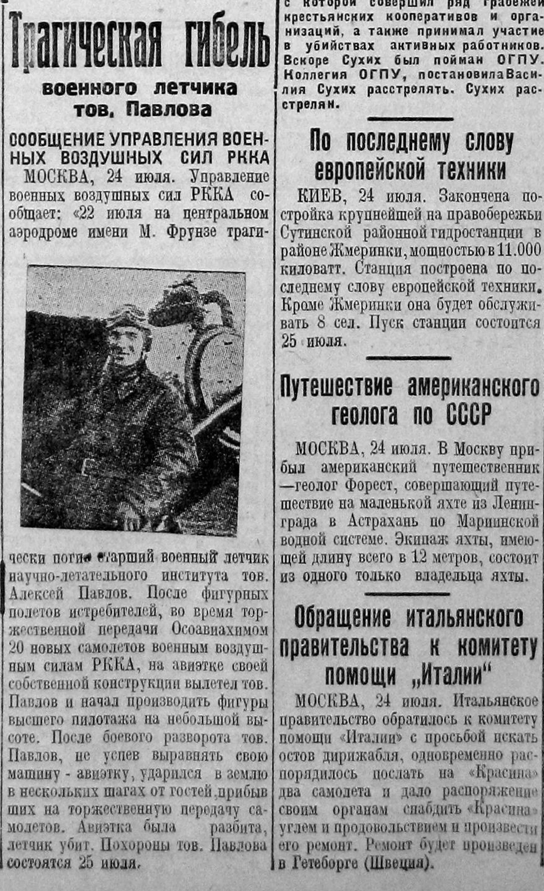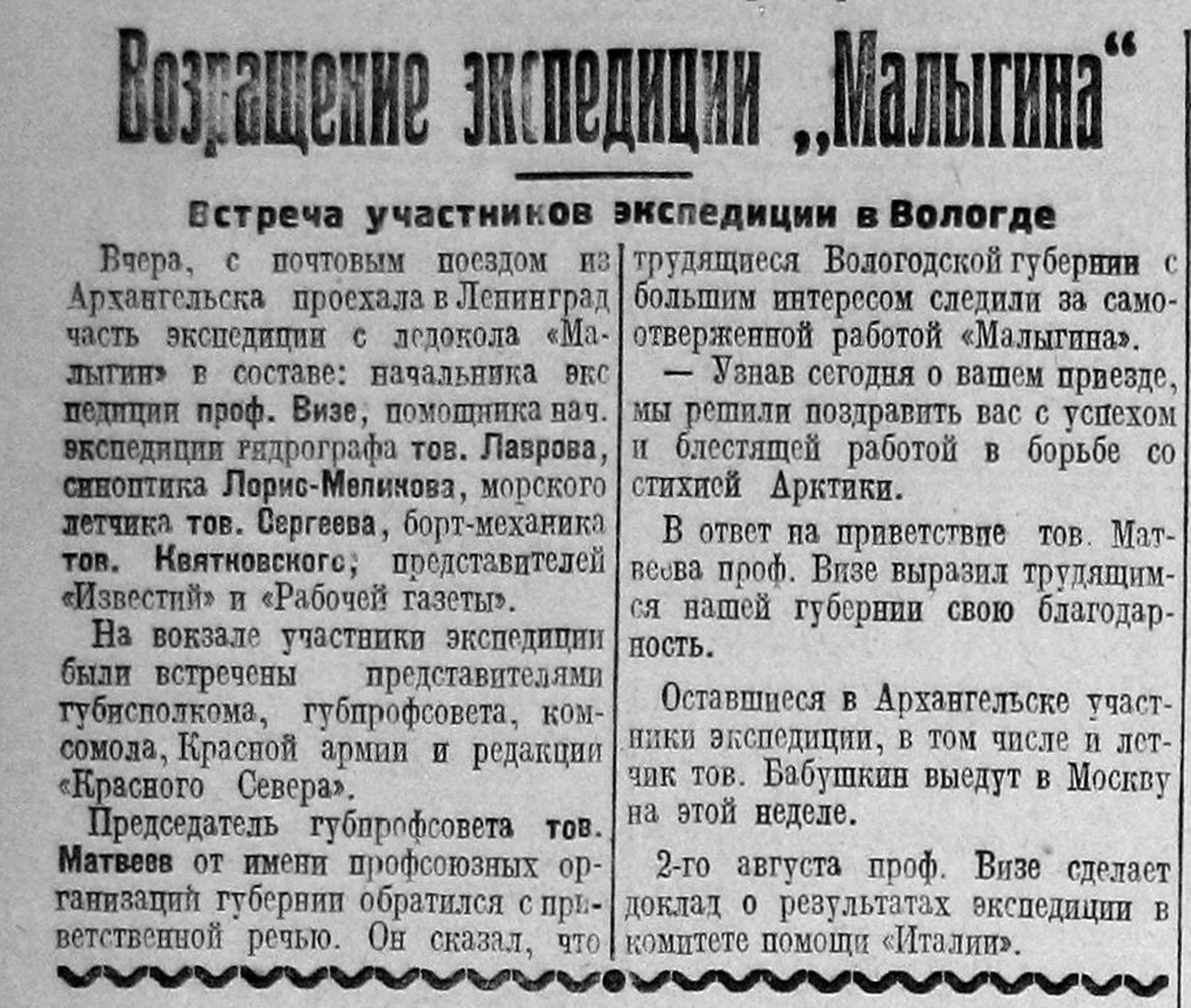 МОСКВА. 24 июля. Народный Комиссар по Иностранным делам СССР Чичерин обратился к вице-председателю русско-американкой торговой палаты Смиту с письмом, в котором просит его передать председателю палаты Шли, что начальник спасательной экспедиции ледокола "Красин" Самойлович и летчик Чухновский - выражают искреннюю благодарность за приветствие по их адресу и приглашение посетить Соединенные Штаты, которым воспользуются по окончании работ.