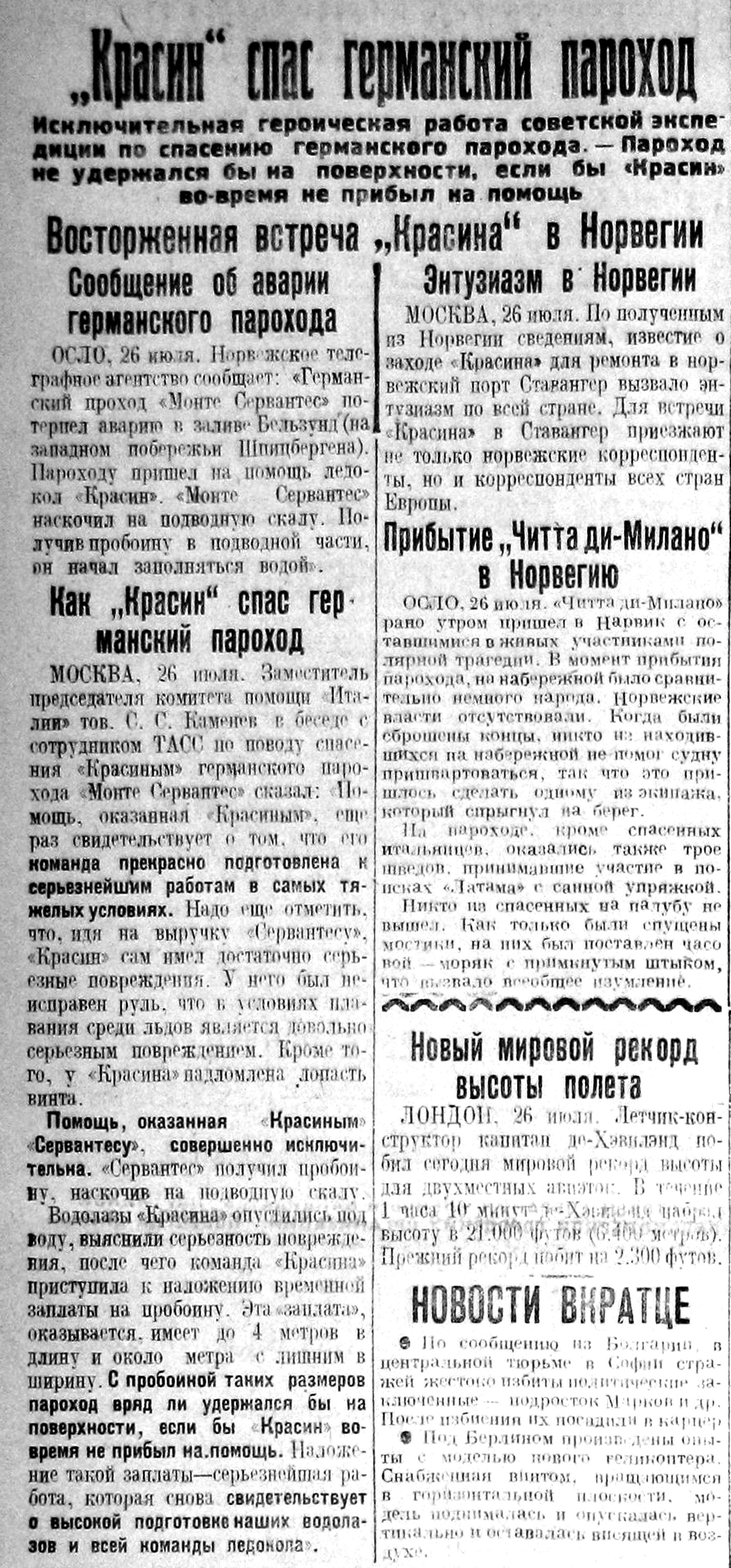 ПАРИЖ, 23 июля. Комментируя успехи "Красина", лево-буржуазная "Вопонтэ" пишет: "Советская Россия дала цивилизованному миру суровый и прекрасный урок международной солидарности". Успех "Красина" представляет собой триумф организации и науки Красной России, так как руководители экспедиции и замечательные приемы, пущенные ими в ход, суть плод молодой советской науки.