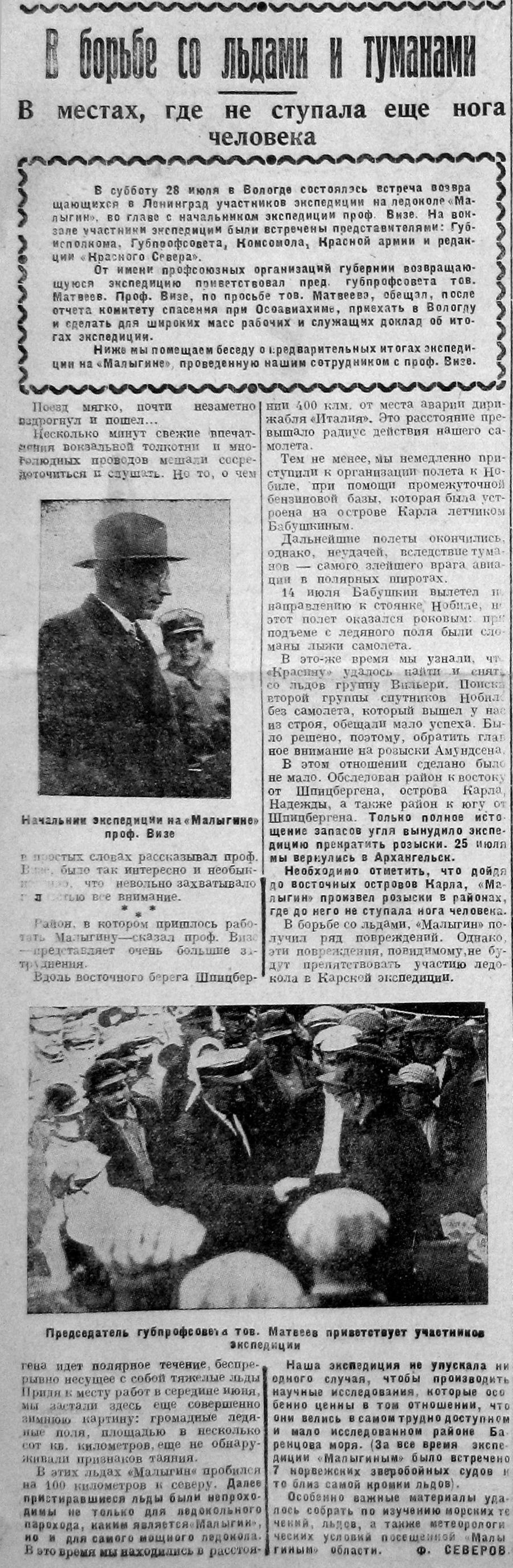 МОСКВА, 23 июля. 22 июля комитет помощи "Италии" получил от проф. Самойловича донесение о его свидании с Нобиле. Вследствие убедительной просьбы Нобиле посетить его, так как из-за сломанной ноги он не выходит из каюты, — сообщает проф. Самойлович, - я отправился в сопровождении Вильери на "Читта ди Милано". Нобиле подавлен, нервно расстроен, он просил разрешения принять участие в дальнейших работах "Красина". Я сообщил, что имею разрешение взять его на борт. На "Читта ди Милано" был дан завтрак в честь "Красина". Речей не было. Нобиле не участвовал. Чухновский остается в Кингсбее".