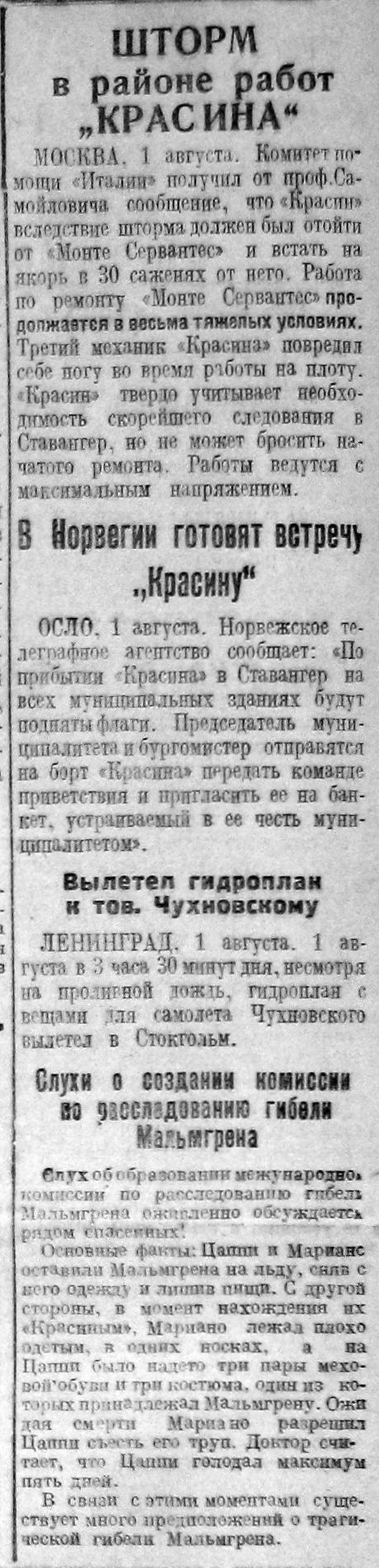 В комитете получены сведения, что "Читта ди-Милано" предполагает возвратиться из Нарвика в Кингсбей, чтобы работать совместно с "Красиным". Получены также сведения о желании шведских авиаторов работать по розыскам, имея базу на "Красине".