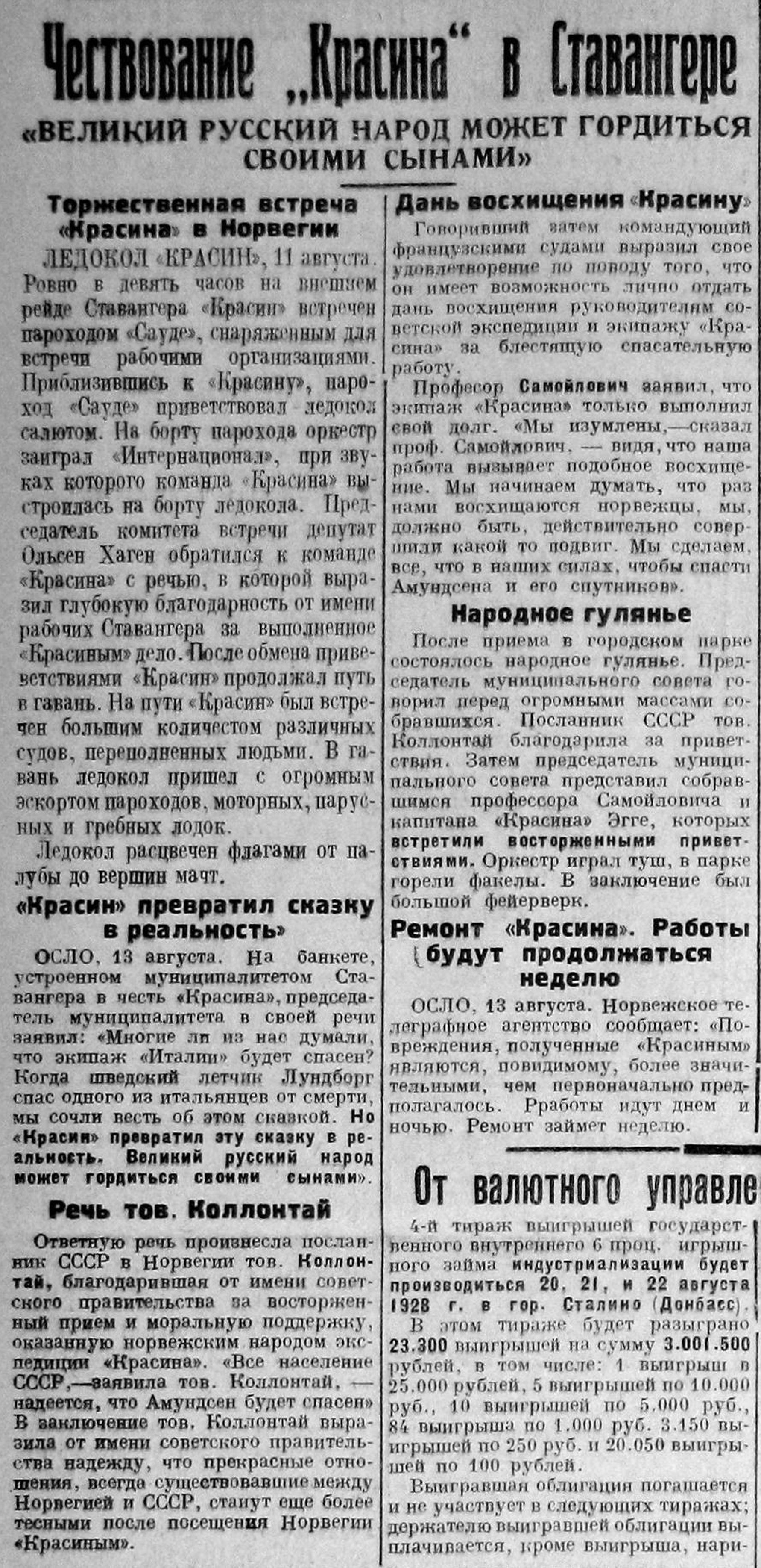 Комитет выясняет, в каком из портов Скандинавии "Красин" сможет быстро и удобно произвести необходимый ремонт и запастись углем и продовольствием, чтобы вновь вернуться к работе по розыскам Амундсена и Алессандри. По расчетам комитета, снабжение и ремонт "Красина" займут не более 12 дней.