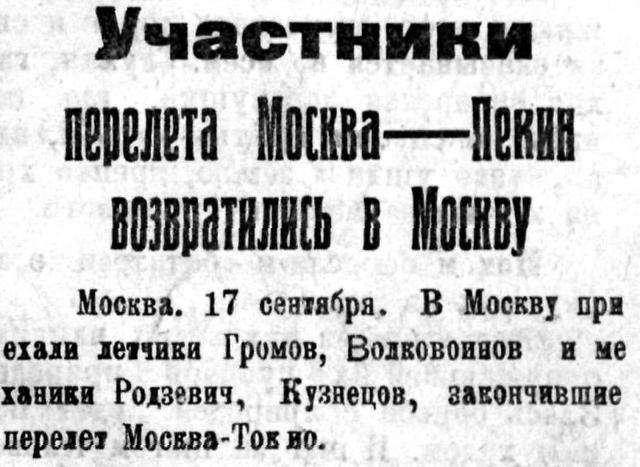 Москва. 17 сентября. В Москву при ехали летчики Громов, Волковойнов и механики Родзевич, Кузнецов, закончившие перелет Москва - Токио.