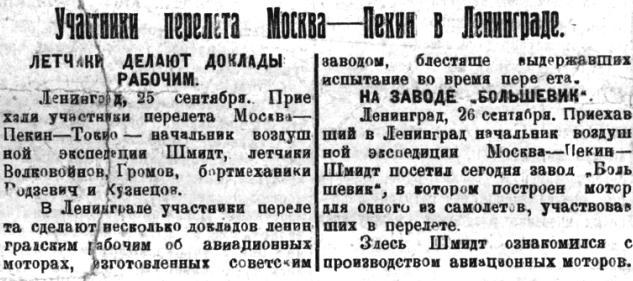 Ленинград, 26 сентября. Приехавший в Ленинград начальник воздушной экспедиции Москва — Пекин — Шмидт посетил сегодня завод "Большевик", в котором построен мотор для одного из самолетов, участвовавших в перелете.
