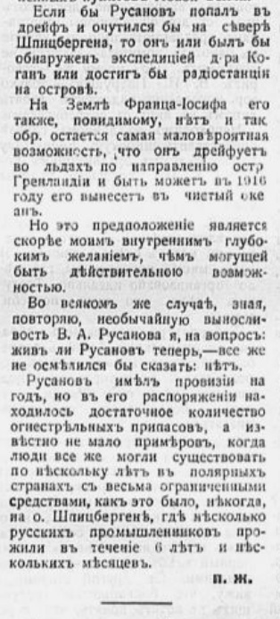В полдень вступили у Caра Muray непроходимы льды и повернули обратно, склоняясь к SO. В 8 ч. вечера стали на якорь у Земли Skott Reltie, по SO сторону островка в Северной части. Слава Богу, сегодня буду спать спокойно. Приходится одному стоять вахту, штурман «болен». Отдохну вволю. Привет милой Верусе от холодного, ледяного, но горячо любящего Георгия.