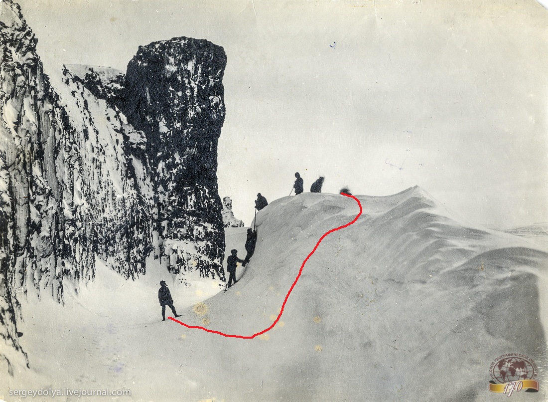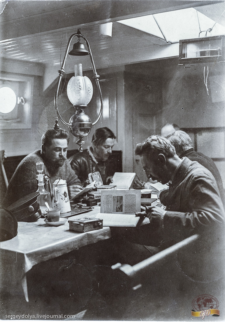Сегодня к вечеру потихло, температура поднялась до -6о. Хороший, тихий день. Завтра праздник: воздвижение Честного Животворящего Креста Господня. Празднику и погода благоприятствует. Обилие полен с опилками. Наружную стенку камбуза заколотили кап и двери в кают-компании. За ужином пили горячий пирог с моржатиной. Очень вкусной и даже нежной. Вечером затеплились лампадки (в каютах) перед образами, в каюте стало как-то теплее и уютнее. Сейчас звучит рояль и ты переносишься в фантастических мечтаниях далеко далеко, за море, домой, туда где, может быть, в настоящую минуту сидит, облокотившись о столик и склонив головку на руку, в таких же мечтаниях моя маленькая Веруня, предмет моего постоянного воспоминания, предмет моего счастья и наслаждения… Очнись, Веруня, посмотри на карту и в точке под 80о23’ с.ш. и 53о восточной долготы от грин. ты, если не увидишь, то почувствуешь любящего тебя твоего Георгия. Он сейчас с тобой всей душой, всем сердцем и всеми мыслями. Привет тебе, мой дорогой друг, и горячий, нежный поцелуй. Спокойной ночи и приятных, радостных сновидений. Я же желаю видеть во сне только тебя…