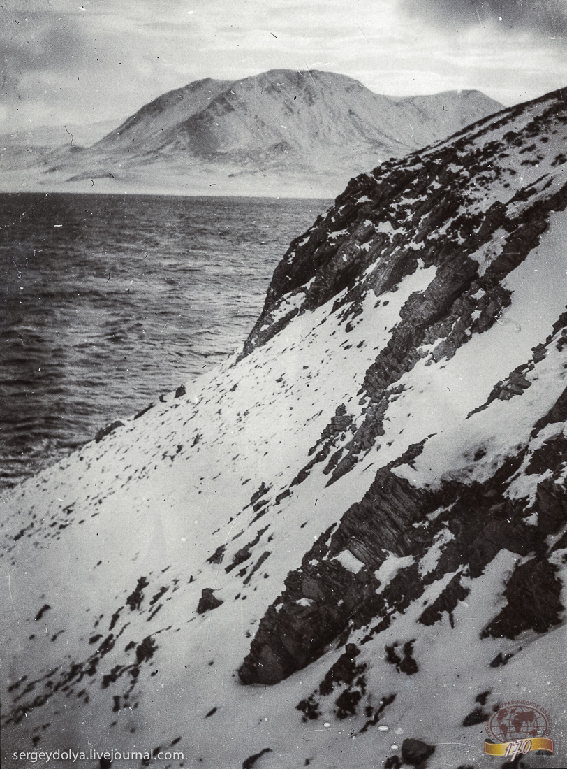 С кормы и с носа занесли стальной трос на берег, на камни, а с мачты взяли на берег толстый пеньковый трос, для того чтобы судно не сползло на глубину, т.к. рельеф дна у берега крутой. Грустно как-то на душе и тяжело на сердце, и все это от того, что среди состава экспедиции есть большие прохвосты. Расплата в России. Во всяком случае, возьмемся за работу и пойдём с Божьей помощью к полюсу.