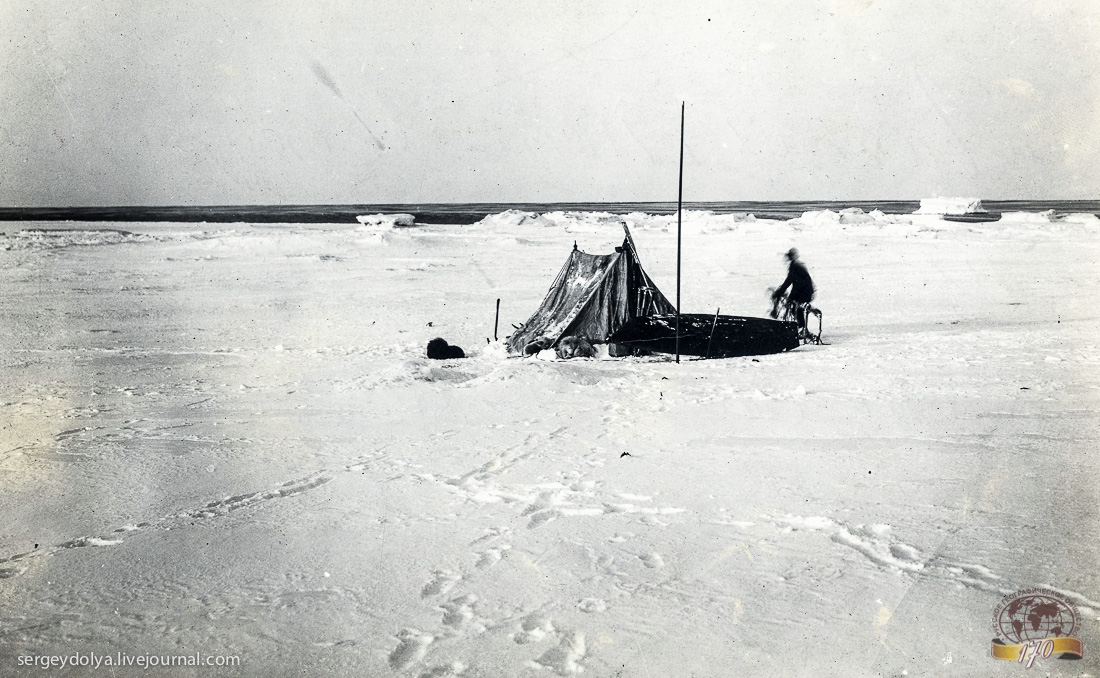 С утра до 4о мороза, а к вечеру дождь и слякоть. Нашли у Глетчера … свой выброшенный дом. Привезли 4 нарты брёвен и досок. Нарту наваливали до 30 – 32 пудов на 10 собак. Тут хорошо. Постараемся перевезти всё. Чудные дрова будут. По дороге на 175 – 200 шагов убил самца пудов на 20 – 25 на льду. Прибежал к нему, схватил за хвост и держал, пока подоспеет помощь. Минуты через три он у меня сорвался, чуть меня самого не стащил за собой в лунку. Ужасно жалею, что не удалось попользоваться его великолепной чёрно-серой шкурой и недурным мясом. Сегодня принял баню. Как сто пудов свалилось с плеч.