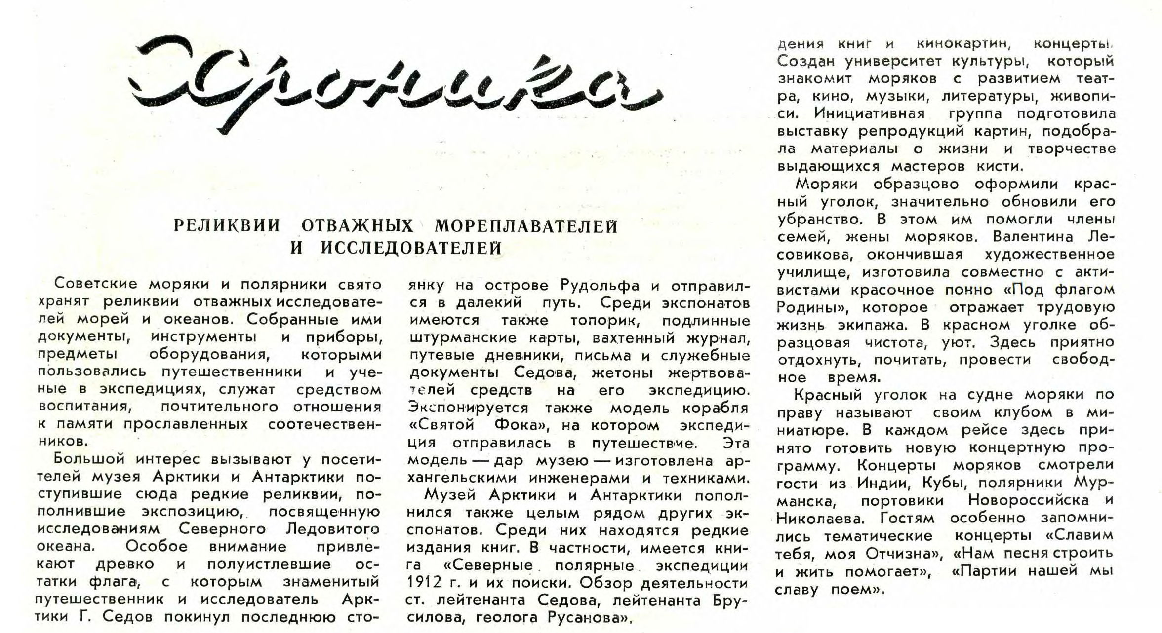 Если судно будет располагать временем, то прошу привести в жилой вид большой рубленый дом. Если судно может располагать лишней шлюпкой, человек на 8 – 10, то прошу таковую оставить на Сара Flora на всякий случай. Все здоровы, все благополучно. Привет. Ст. лет. Седов.
