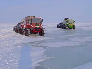 В Карском море нам встретилось совершенно новое для нас препятствие - поля блинчатого льда, где круглые льдины - "блины" от 5 до 20 метров диаметром окаймлены снежно-ледовой бахромой высотой до метра и более, а между "блинами" трещины глубиной до метра. Езды по этим "блинчикам" не пожелаешь и врагу, тем более нашим любимым "зеленому" и "красному" вездеходам. Они идут по этому ужасу на первой-второй передаче, ухитряясь к тому же тянуть по три прицепа. Нагрузки на трансмиссию страшные, но пока техника справляется. Мы все скучаем по своим родным и любимым и передаем приветы друзьям.