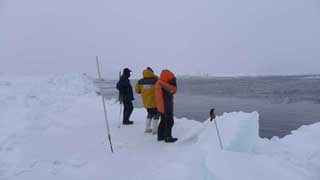 Находимся у самого острова Воронина, видим высокий маяк, но нас от него отделяет большая полынья шириной от 300 до 3000 метров. Чтобы перебраться на островной припай надо найти максимальное сужение полыньи. Ветер дует с северо-востока, усиливается. Едем вдоль полыньи на север, находим узкое место с тонким льдом, где ширина воды не больше 200 метров. Разведчики вышли с пешнями на лед - докладывают, что без прицепов машина проскочить сможет до воды, чтобы сократить время и расстояние плавания. Учитываем снос из-за ветра и выбираем место на том берегу для выхода машин из воды. Итак, решение плыть принято. Готовим лодку, фифы, блоки, кевларовые троса, распределяем роли - все семеро будут задействованы. Ветер еще усилился, и лед пошел, стал дрейфовать. Поле тонкого льда, по которому мы собирались разгоняться начинает сужать водяной канал и он исчезает у нас на глазах. Но и слева и справа вода остается. Перескочить здесь, разогнавшись по тонкому льду-наш единственный шанс.